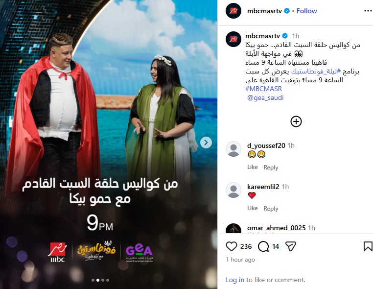 ومن المقرر إذاعة الحلقة السبت المقبل، وكشفت قناة إم بي سي مصر عن كواليس من الحلقة، وكتبت من خلال حسابها الرسمي عبر موقع تبادل الصور والفيديوهات القصيرة إنستجرام: «من كواليس حلقة السبت القادم.. حمو بيكا في مواجهة الأبلة فاهيتا مستنياه الساعة 9 مساءً.. برنامج ليلة فونطاستيك يعرض كل سبت الساعة 9 مساءً بتوقيت» القاهرة.