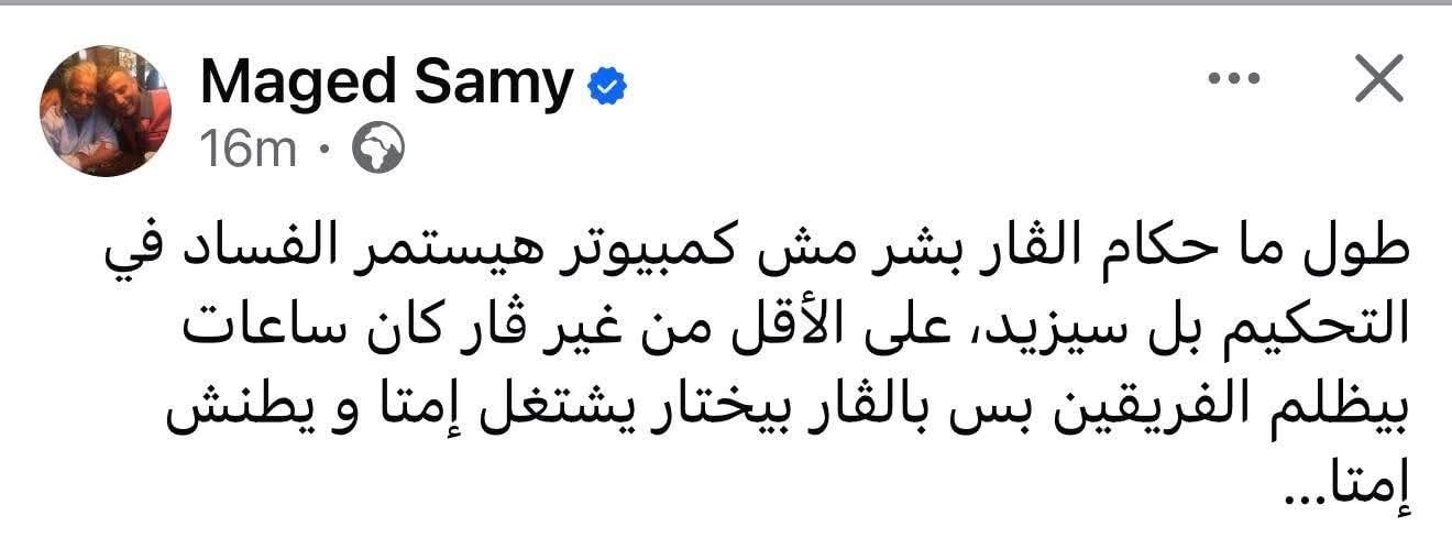 وانتقد سامي عبر حسابه الرسمي على موقع «فيس بوك» أداء حكام تقنية الفيديو (VAR)، حيث نشر صورتين من لقطات المباراة، وعلّق قائلًا: «طول ما حكام الـVAR بشر مش كمبيوتر، الفساد في التحكيم هيستمر بل وهيزيد، على الأقل من غير VAR كان الظلم ساعات بيبقى على الفريقين، لكن بالـVAR بيختار يشتغل إمتى ويطنش إمتى».