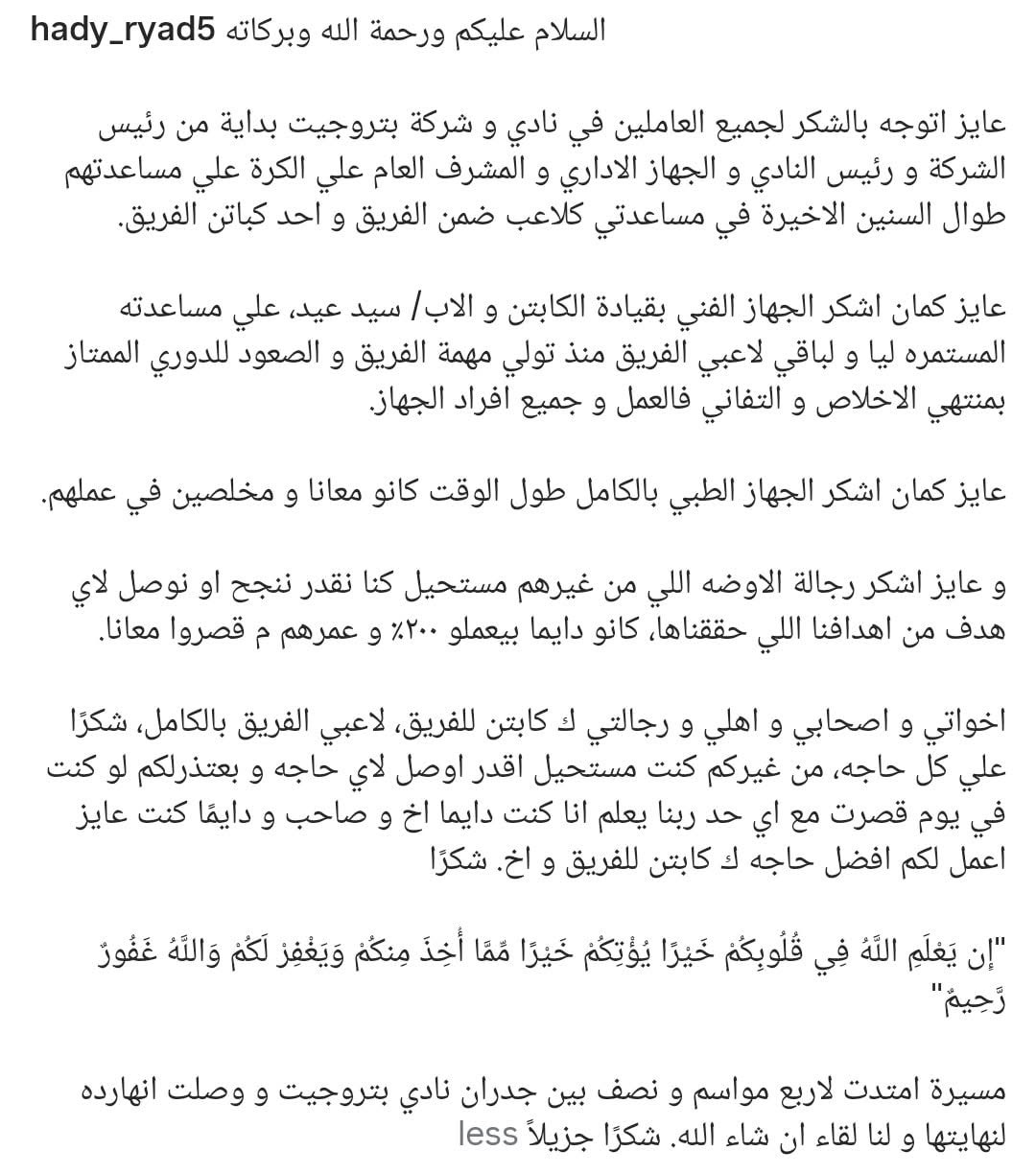 وأكمل: “إخوتي وأصحابي وأهلي ورجالتي ك كابتن للفريق، لاعبي الفريق بالكامل، شكرًا علي كل حاجه، من غيركم كنت مستحيل أقدر أوصل لأي حاجة وبعتذرلكم لو كنت في يوم قصرت مع أي حد ربنا يعلم أنا كنت دايما أخ وصاحب ودايمًا كنت عايز اعمل لكم افضل حاجه ك كابتن للفريق وأخ. شكرًا، “إِن يَعْلَمِ اللَّهُ فِي قُلُوبِكُمْ خَيْرًا يُؤْتِكُمْ خَيْرًا مِّمَّا أُخِذَ مِنكُمْ وَيَغْفِرْ لَكُمْ وَاللَّهُ غَفُورٌ رَّحِيمٌ””.