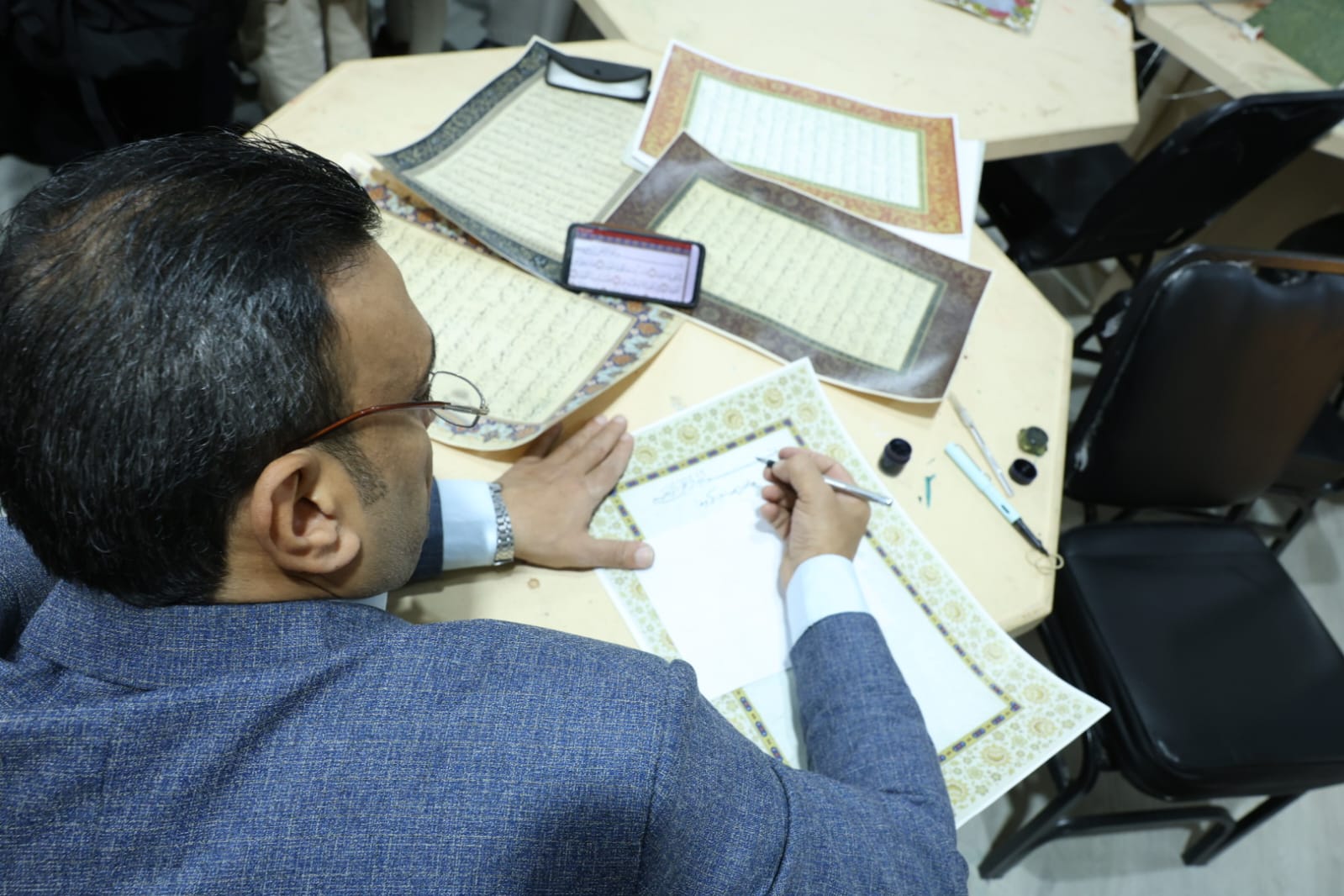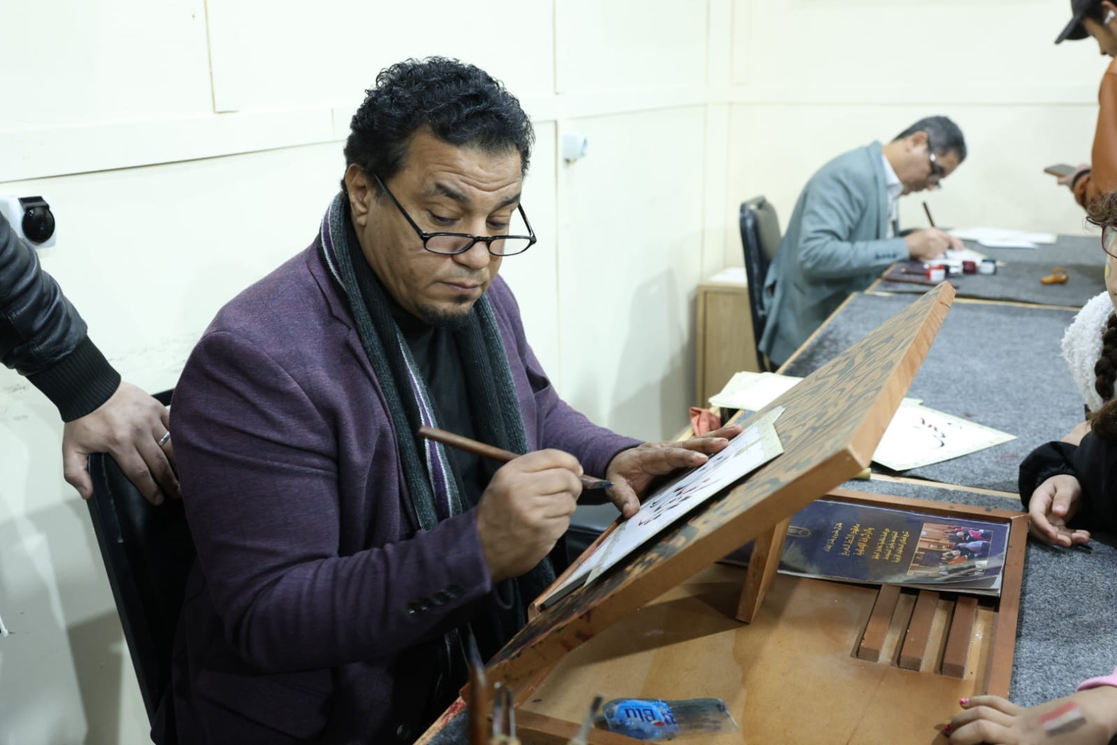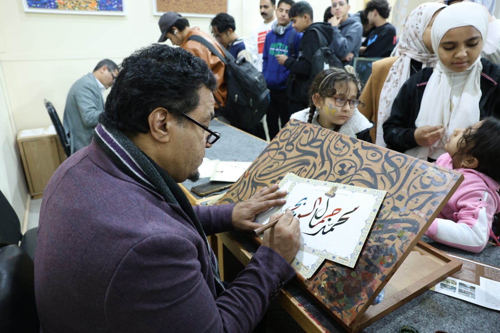 وفي ركن الخط العربي، واصلت ورش تعليم الخط نشاطها، مع كتابة أسماء الزائرين على كروت تُقدَّم لهم كهدايا تذكارية، حيث يشارك في استيعاب الإقبال المتزايد ثلاثة خطاطين بقيادة الفنان إسماعيل عبده، وسط تفاعل كبير من زوار الجناح من مختلف الأعمار.