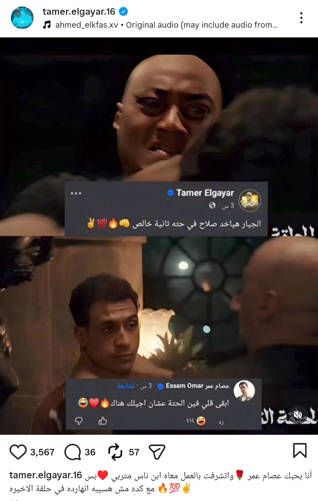 وكتب تامر الجيار من خلال حسابه الرسمي عبر موقع تبادل الصور والفيديوهات القصيرة إنستجرام، قال: أنا بحب عصام عمر واتشرفت بالعمل معاه ابن ناس متربي.. بس مع كده مش هسيبه انهاردة في الحلقة الأخيرة.