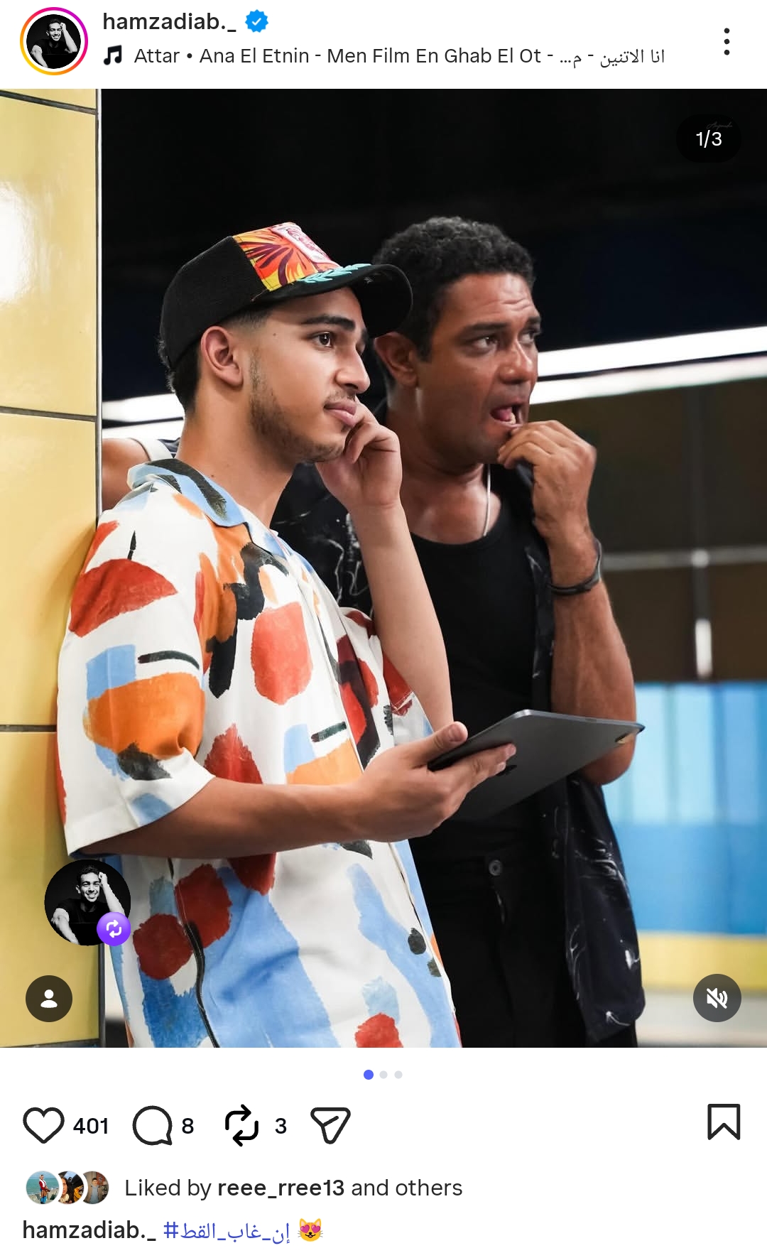 ونشر حمزة دياب الكواليس من خلال حسابه الرسمي عبر موقع تبادل الصور والفيديوهات القصيرة إنستجرام، وعلق: «إن غاب القط».