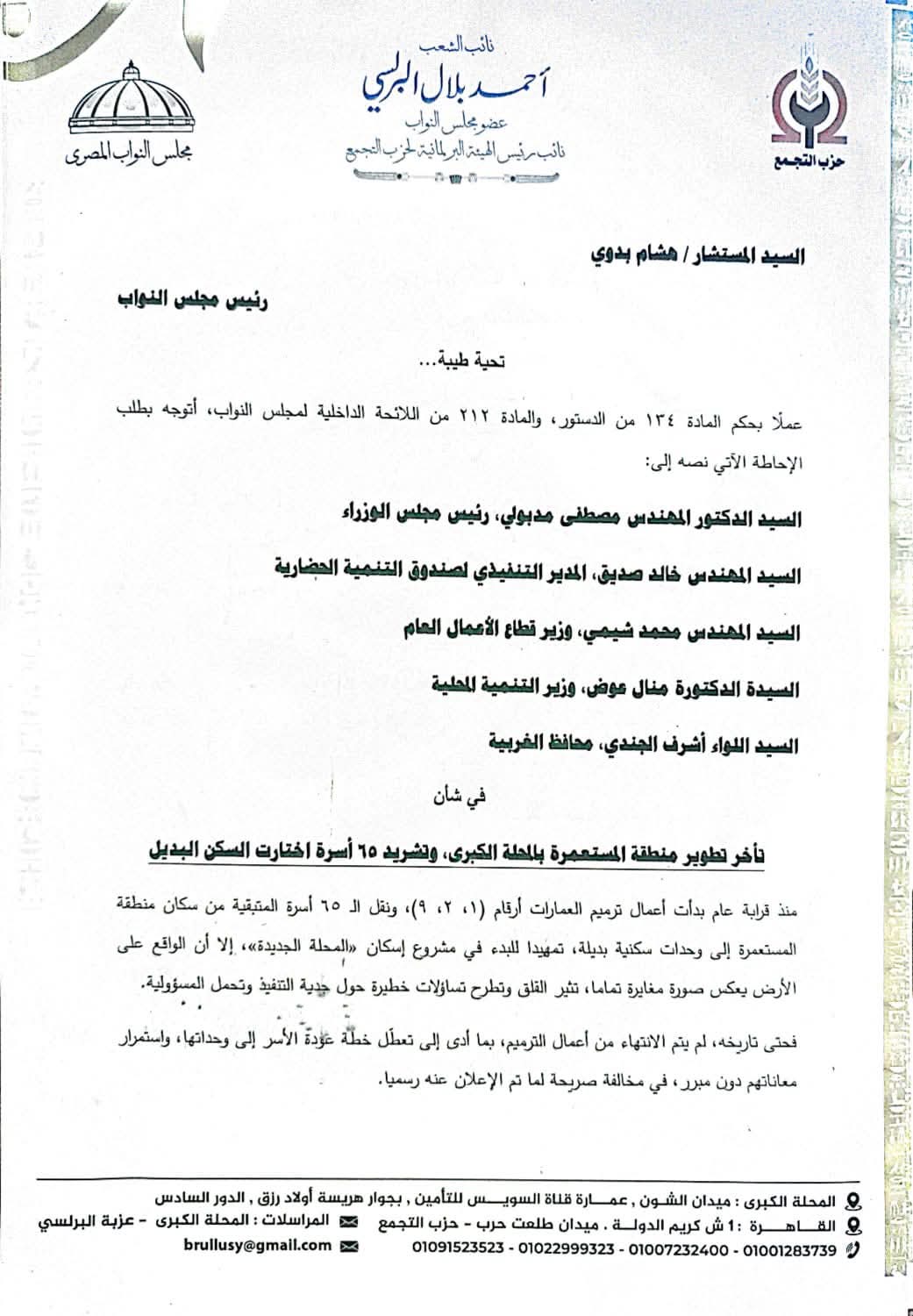 تقدم النائب أحمد بلال البرلسي، عضو مجلس النواب عن مدينة المحلة الكبرى، بطلب إحاطة عاجل إلى رئيس مجلس الوزراء ووزراء (قطاع الأعمال، التنمية المحلية) ومحافظ الغربية، بشأن ما وصفه بـ"الجريمة الإنسانية" نتيجة تأخر تطوير منطقة "المستعمرة" وتشريد 65 أسرة من سكانها.