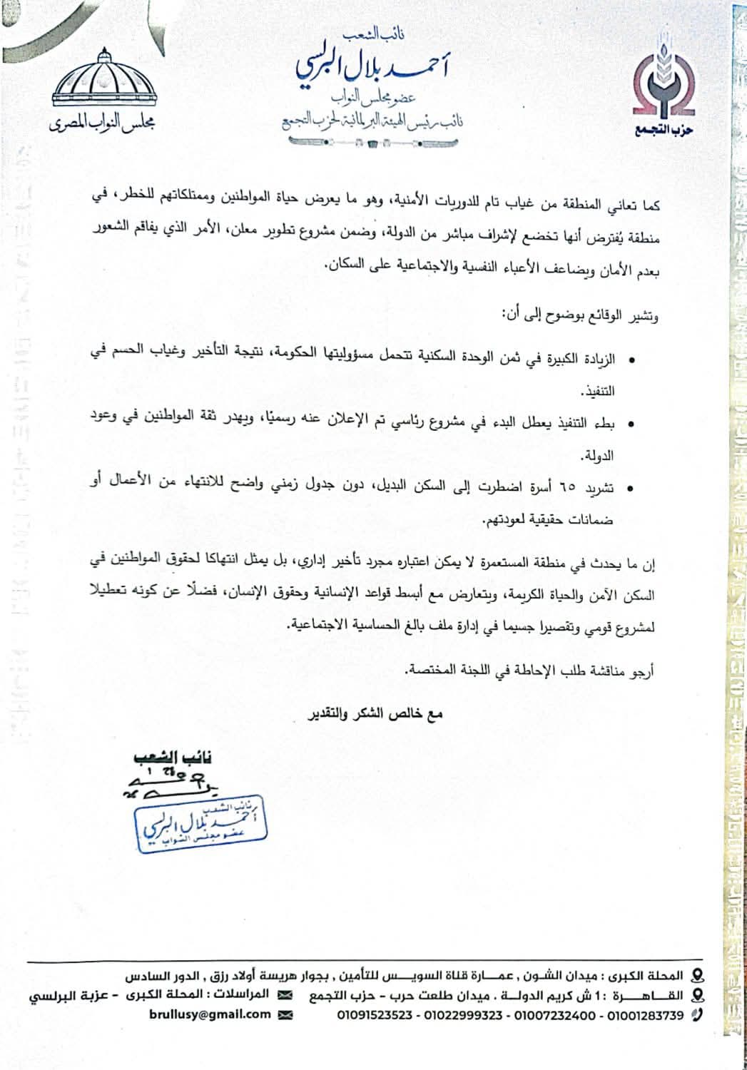 وأوضح البرلسي في طلبه أن 65 أسرة متبقية من سكان المنطقة يعيشون في حالة من عدم الاستقرار منذ قرابة عام، بعد نقلهم إلى وحدات بديلة تمهيداً لترميم عماراتهم (1، 2، 9) والبدء في مشروع المحلة الجديدة، وأشار إلى أن أعمال الترميم توقفت دون مبرر، مما تسبب في تعطل عودة الأهالي لوحداتهم وضياع حقوقهم في سكن آمن وكريم.