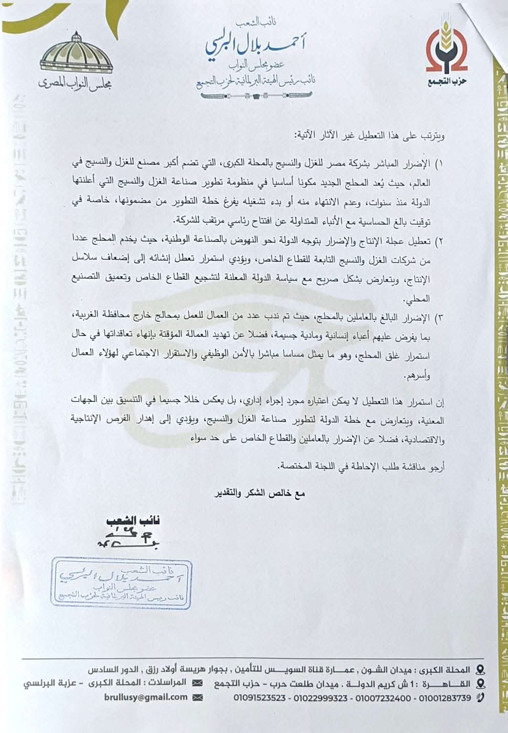 وكشف البرلسي في طلبه الموجه إلى رئيس الوزراء ووزيري قطاع الأعمال والتنمية المحلية، عن واقعة وصفها بغير المنطقية، حيث تم الانتهاء من إنشاء أكبر مصنع غزل في العالم بالمحلة الكبرى، بينما تعطل بناء المحلج الجديد الذي يعد المكون الأساسي لمنظومة التشغيل.