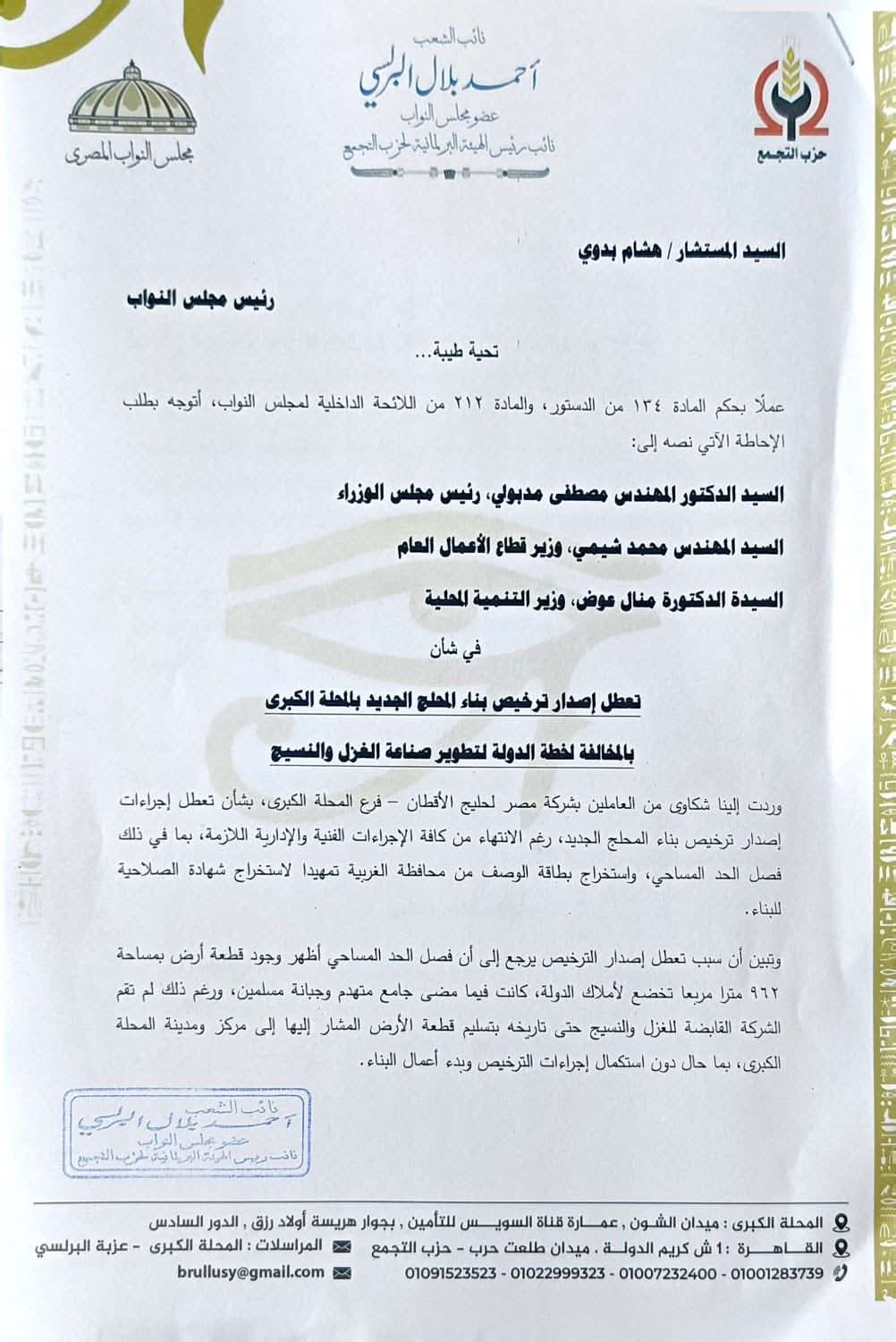 وأوضح طلب الإحاطة أن العائق أمام استخراج ترخيص بناء المحلج يرجع إلى قطعة أرض بمساحة 962 متراً مربعاً تتبع أملاك الدولة (كانت قديماً جامعاً متهدماً وجبانة)، ورغم انتهاء كافة الإجراءات الفنية، إلا أن الشركة القابضة ترفض تسليم هذه المساحة لمركز ومدينة المحلة.