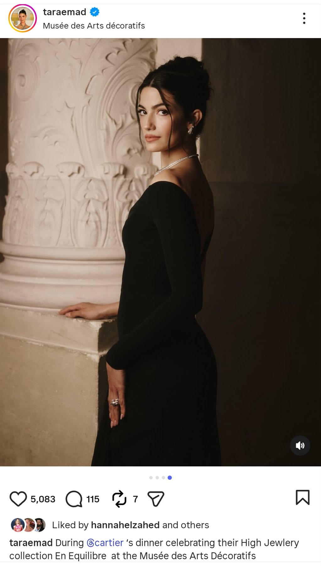 وشاركت تارا عماد جمهورها صورا من أحدث جلسة تصوير لها في باريس، حيث ظهرت بفستان أسود مفتوح، من خلال حسابها الرسمي عبر موقع تبادل الصور والفيديوهات القصيرة إنستجرام، وكتبت: عشاء كارتييه احتفالاً بمجموعة المجوهرات الراقية En Equilibre في Musée des Arts Décoratifs