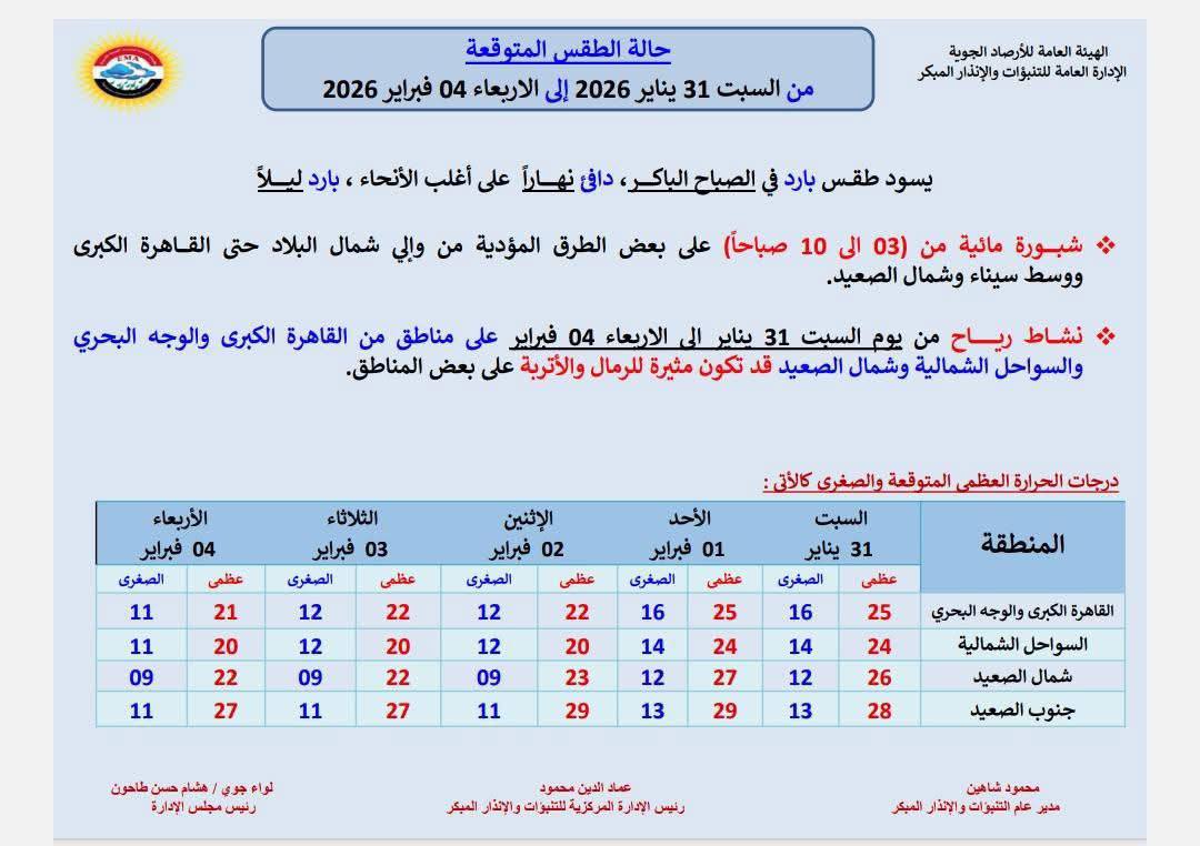 تشير توقعات حالة الطقس غدا السبت 31 يناير 2026 إلى أجواء باردة في الصباح الباكر على مختلف المناطق، خاصة القاهرة الكبرى والوجه البحري والسواحل الشمالية وشمال الصعيد.