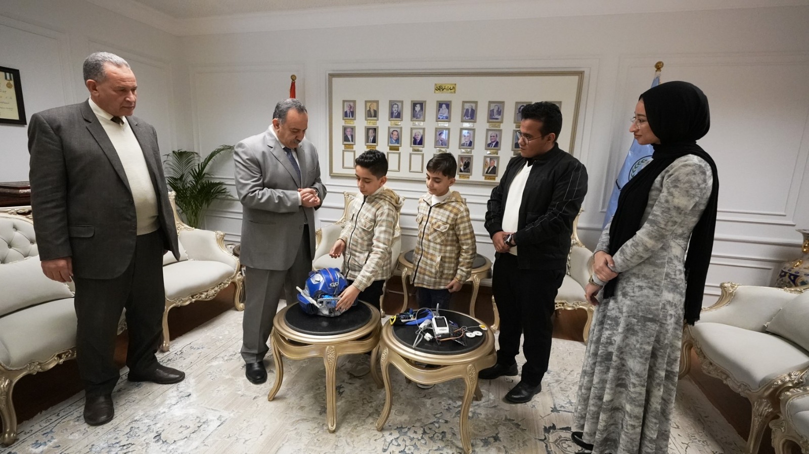 وخلال اللقاء، استعرض الطالب يوسف محمود سرور بالصف الخامس الابتدائي، والطالب يحيى محمود سرور بالصف الرابع الابتدائي بمدرسة دار الأقصى، مشروعهما الابتكاري المتمثل في اختراع “الخوذة الذكية”، والذي يهدف إلى خدمة عدد من المجالات الحيوية، من بينها أعمال الإطفاء، واستكشاف الفضاء، والتنقيب في المناجم، والعمل في البيئات الخطرة.