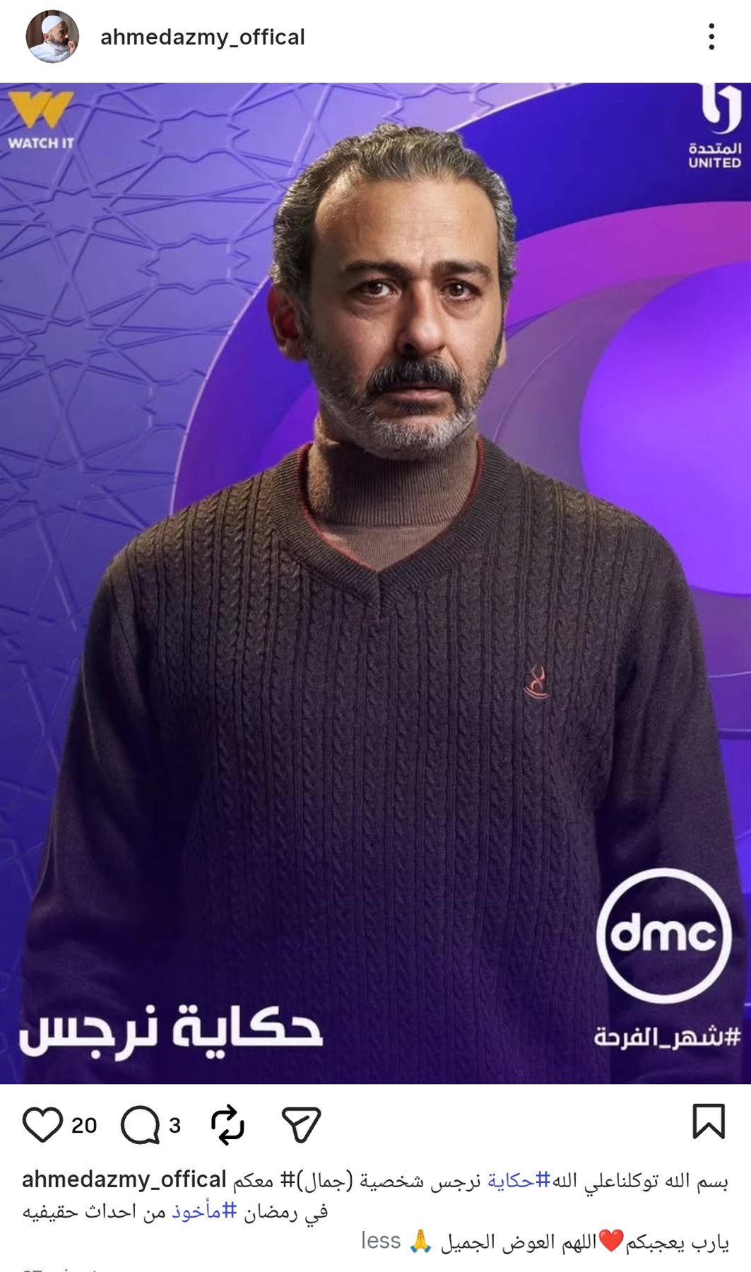 ويجسد أحمد عزمي خلال أحداث العمل، شخصيتة جمال، ونشر أحمد عزمي البوستر الفردي له في العمل، من خلال حسابه الرسمي عبر موقع تبادل الصور والفيديوهات القصيرة «إنستجرام»، وكتب:«بسم الله توكلنا على الله حكاية نرجس شخصية جمال معكم في رمضان مأخوذ من أحداث حقيقية».