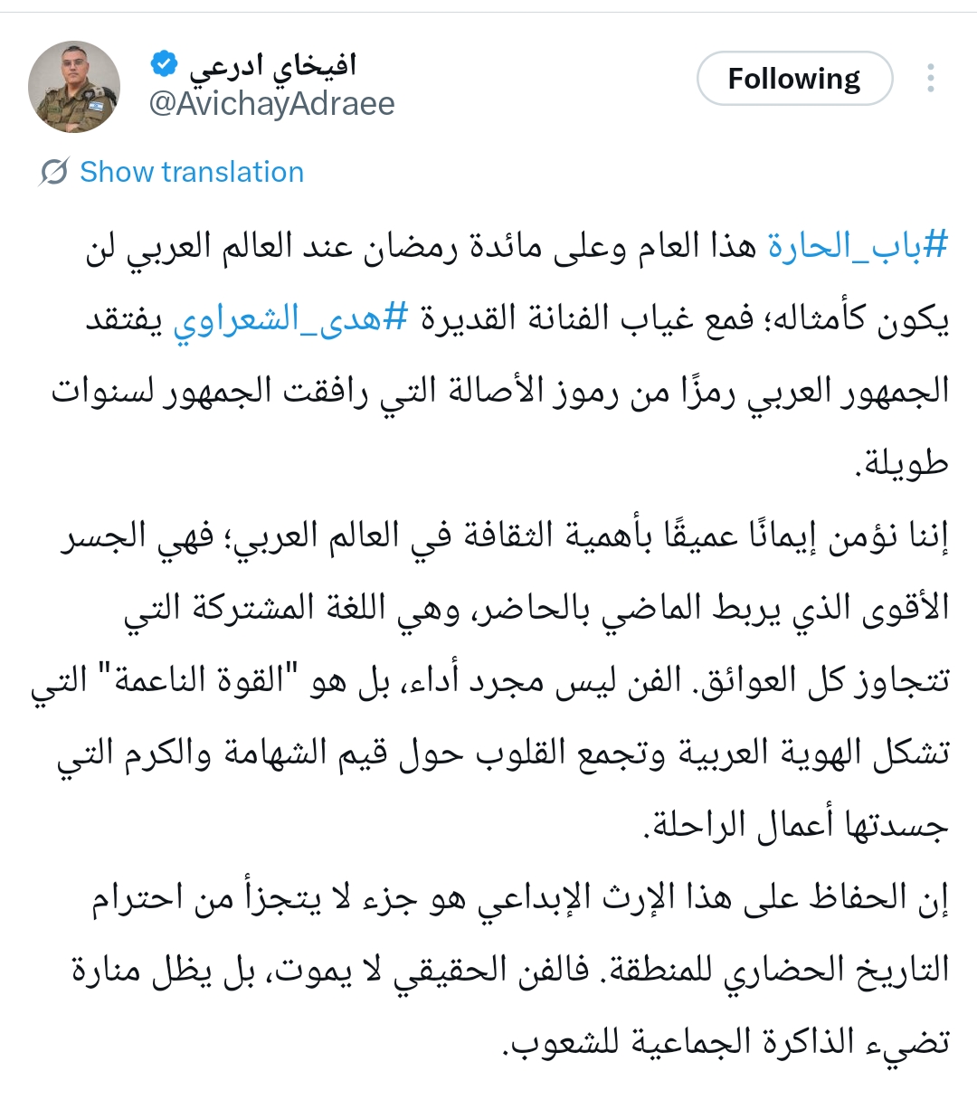 وكتب أفيخاي أدرعي من خلال حسابه الرسمي عبر موقع التواصل الاجتماعي إكس، قال: باب الحارة هذا العام وعلى مائدة رمضان عند العالم العربي لن يكون كأمثاله؛ فمع غياب الفنانة القديرة هدى الشعراوي يفتقد الجمهور العربي رمزًا من رموز الأصالة التي رافقت الجمهور لسنوات طويلة.