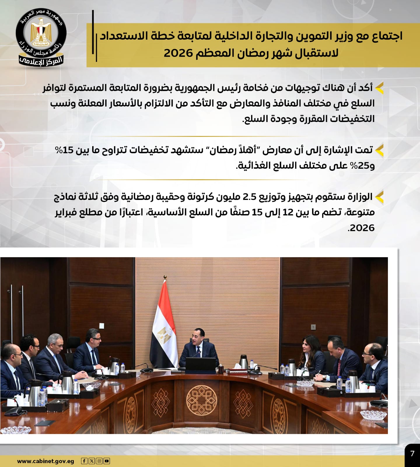 كما اجتمع رئيس الوزراء مع وزير التموين، لمتابعة خطة الاستعداد لاستقبال شهر رمضان المعظم 2026.