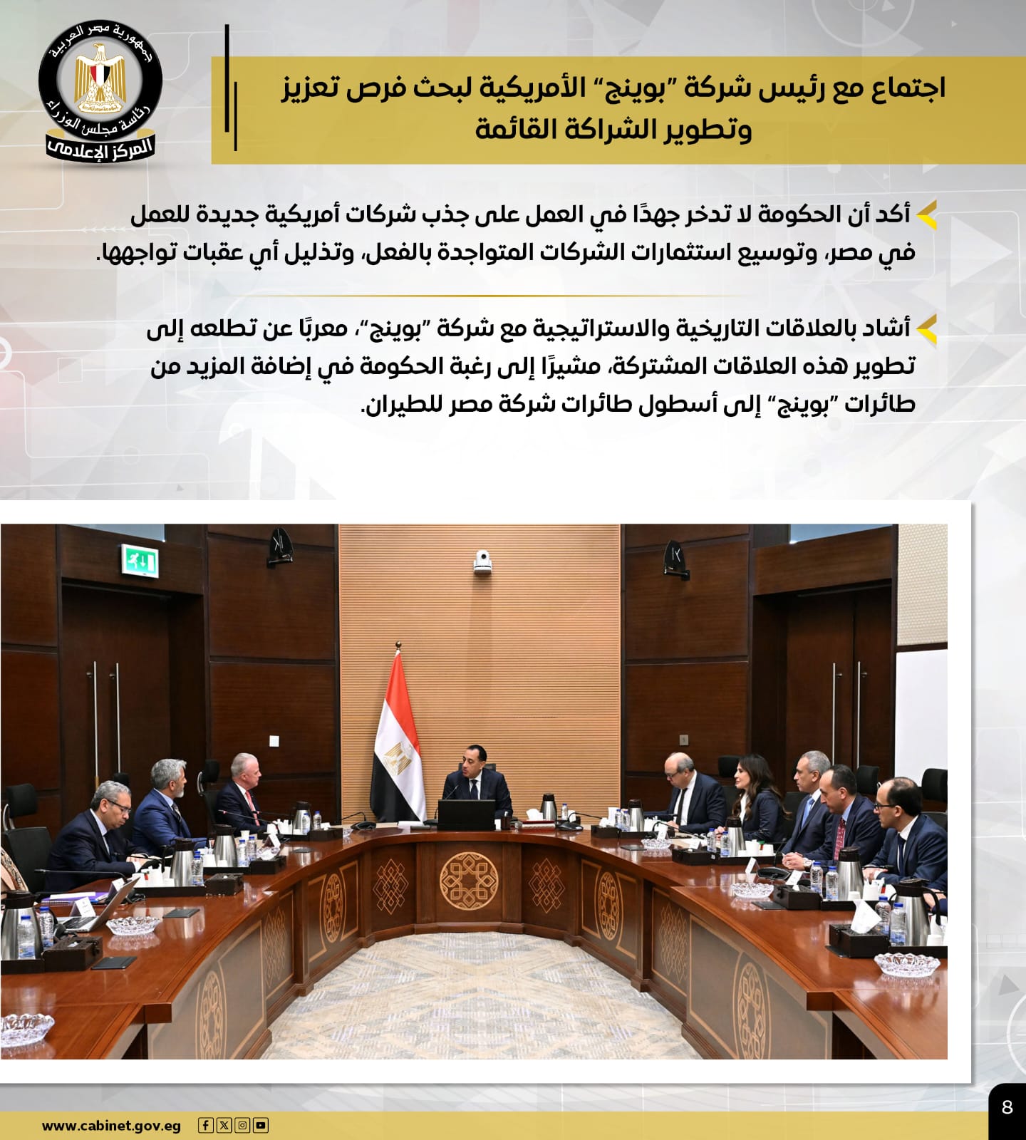كما عقد سيادته اجتماعًا مع رئيس شركة "بوينج" الأمريكية، لبحث فرص تعزيز وتطوير الشراكة القائمة، مؤكدًا أن الحكومة لا تدخر جهدًا في العمل على جذب شركات أمريكية جديدة للعمل في مصر، وتوسيع استثمارات الشركات القائمة وتذليل أي عقبات تواجهها.