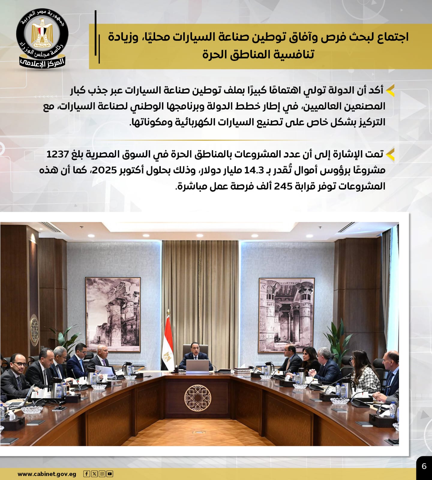 وعقد رئيس الوزراء اجتماعًا لبحث فرص وآفاق توطين صناعة السيارات محليًا، وزيادة تنافسية المناطق الحرة.