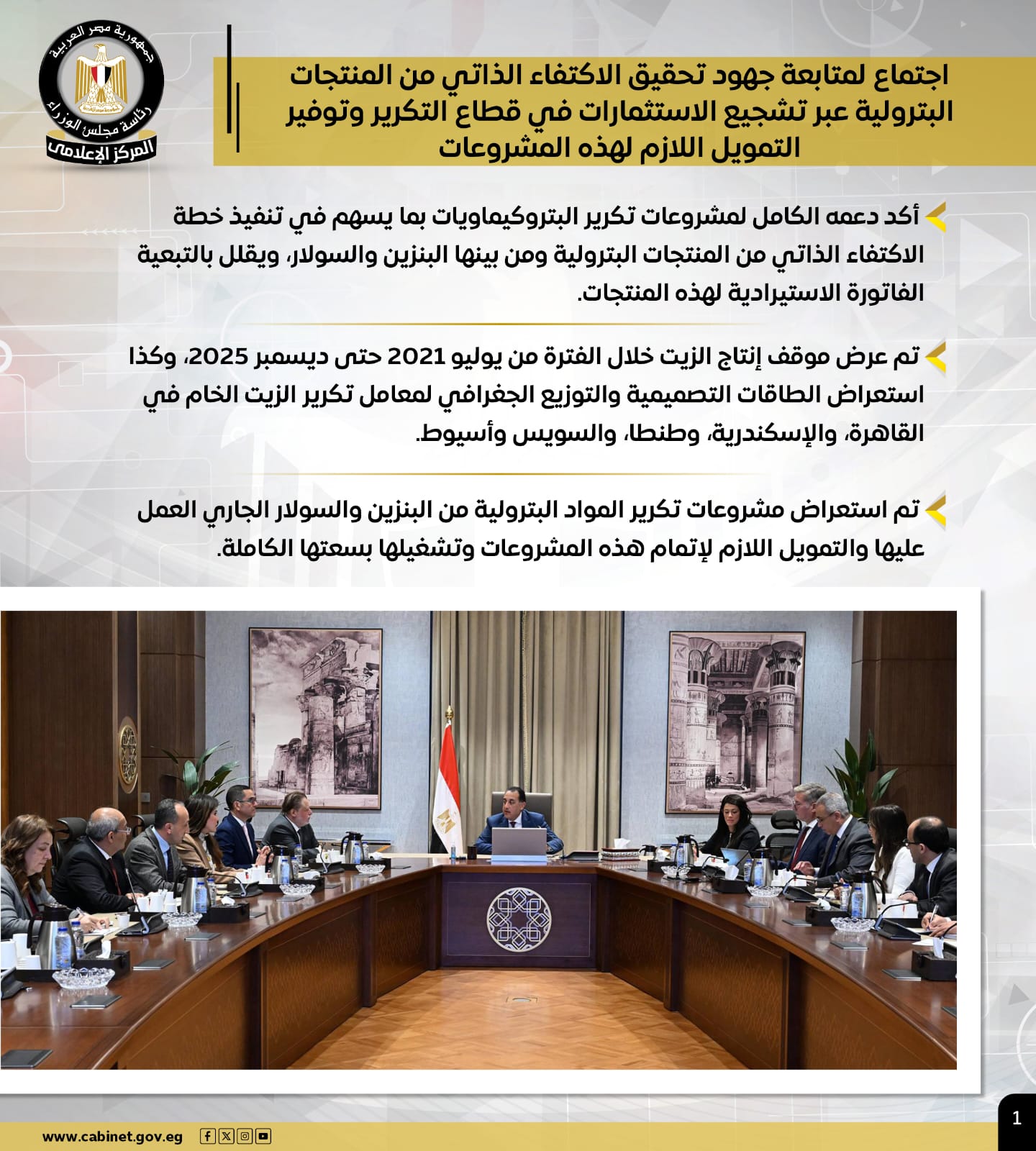 وتضمنت الأنشطة، اجتماعًا لرئيس الوزراء لمتابعة جهود تحقيق الاكتفاء الذاتي من المنتجات البترولية، عبر تشجيع الاستثمارات في قطاع التكرير وتوفير التمويل اللازم لهذه المشروعات.