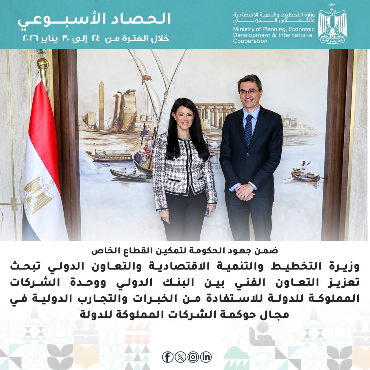 أصدرت وزارة التخطيط والتنمية الاقتصادية والتعاون الدولي، تقرير الحصاد الأسبوعي عن الأسبوع المنقضي الذي شهد زخما من الفعاليات واللقاءات.