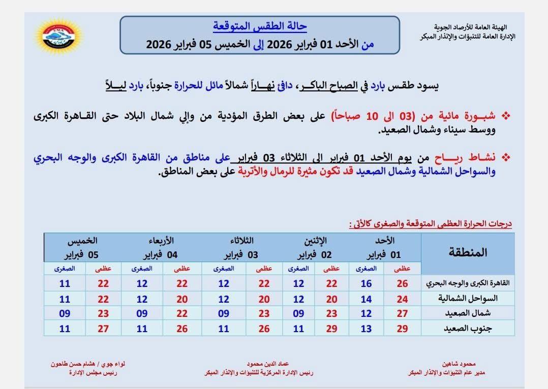 وتكشف الهيئة العامة للأرصاد الجوية عن تفاصيل الطقس المتوقع اعتبارًا من الأحد 1 فبراير 2026 وحتى الخميس 5 فبراير 2026، موضحة أبرز الظواهر الجوية ودرجات الحرارة المتوقعة على جميع الأنحاء.