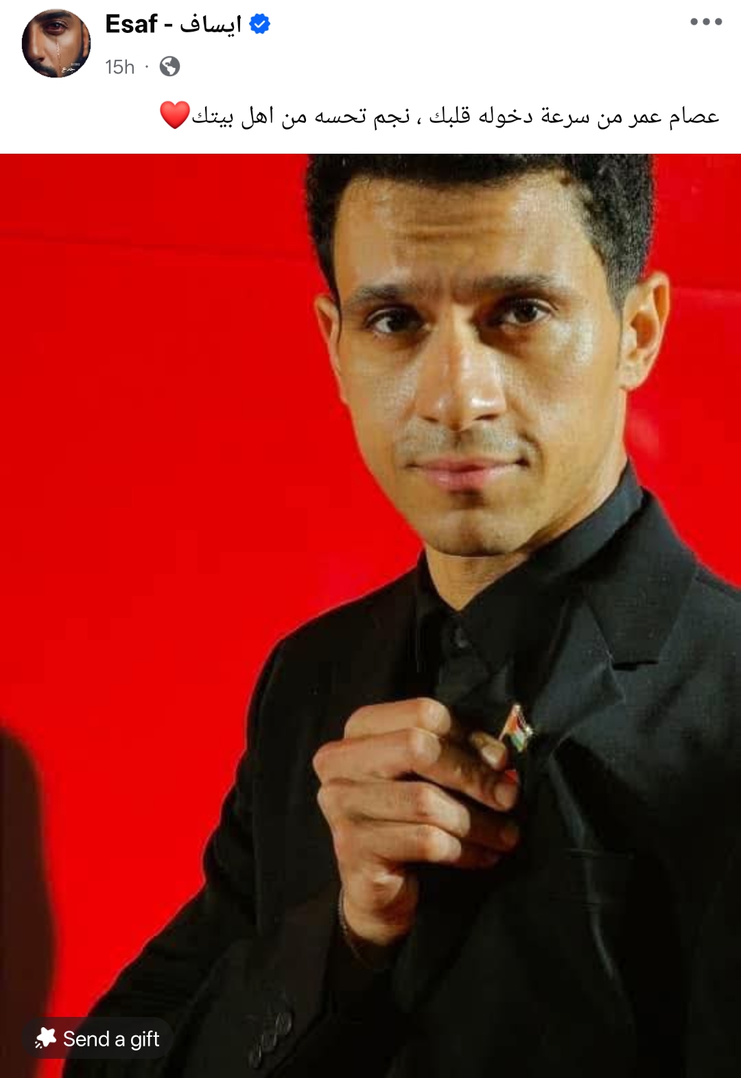 ووجه إيساف رسالة لـ عصام عمر، وكتب من خلال حسابه الرسمي عبر موقع التواصل الاجتماعي «فيسبوك»، قال: «عصام عمر من سرعة دخوله قلبك، نجم تحسه من أهل بيتك».