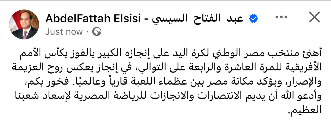 وكتب الرئيس السيسي، تدوينة علي صفحته الرسمية بموقع التواصل الاجتماعي " فيس بوك" اليوم السبت :" أهنئ منتخب مصر الوطني لكرة اليد على إنجازه الكبير بالفوز بكأس الأمم الأفريقية للمرة العاشرة والرابعة على التوالي، في إنجاز يعكس روح العزيمة والإصرار، ويؤكد مكانة مصر بين عظماء اللعبة قاريا وعالميًا.. فخور بكم، وأدعو الله أن يديم الانتصارات والإنجازات للرياضة المصرية لإسعاد شعبنا العظيم".
