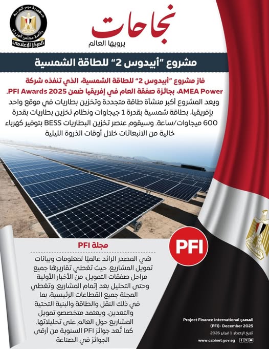 نشر المركز الاعلامي لمجلس الوزراء ، يوضح فيه ان مشروع "أبيدوس 2" للطاقة الشمسية في أسوان يفوز بجائزة صفقة العام في إفريقيا ضمن PFI Awards 2025، ليكون نموذجًا متقدمًا للتكامل بين الطاقة الشمسية بقدرة 1 جيجاوات وأنظمة تخزين البطاريات بقدرة 600 ميجاوات/ساعة، موفرًا كهرباء نظيفة لأكثر من 500 ألف أسرة سنويًا.