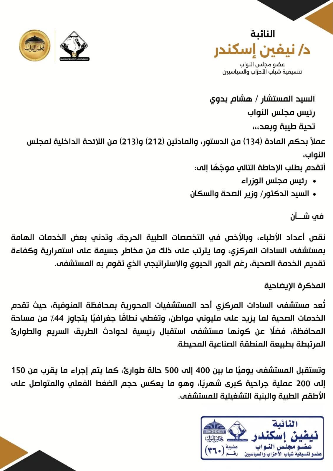 نيفين إسكندر تتقدم بطلب إحاطة لدعم مستشفى السادات المركزي بالمنوفية