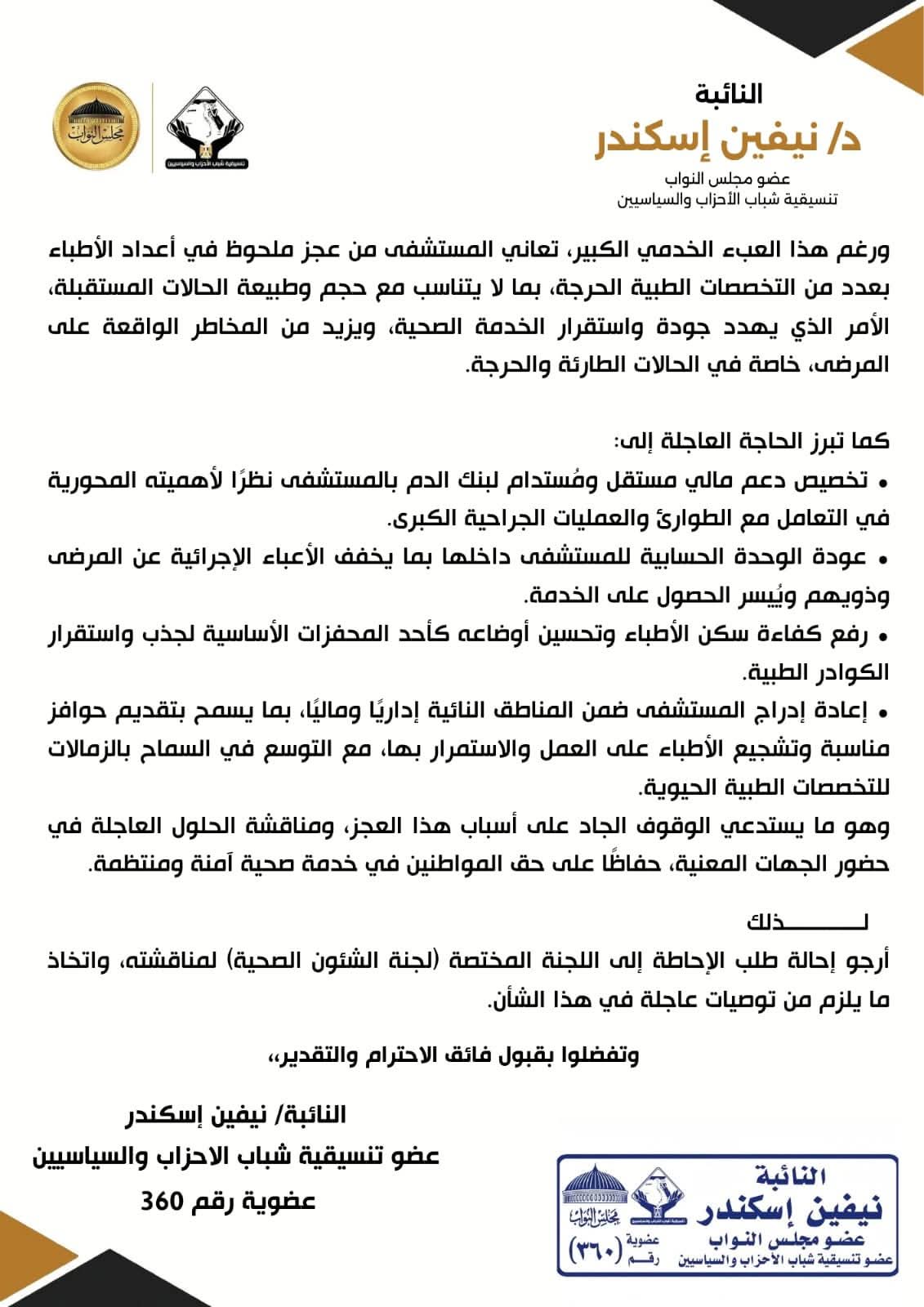 كما طالبت النائبة بإدراج المستشفى ضمن المناطق النائية إداريًا وماليًا، بما يسمح بتقديم حوافز مناسبة لتشجيع الأطباء على العمل والاستمرار، مع التوسع في إتاحة الزمالات للتخصصات الطبية الحيوية، مؤكدة أن الصحة حق أساسي لا يقبل التأجيل.