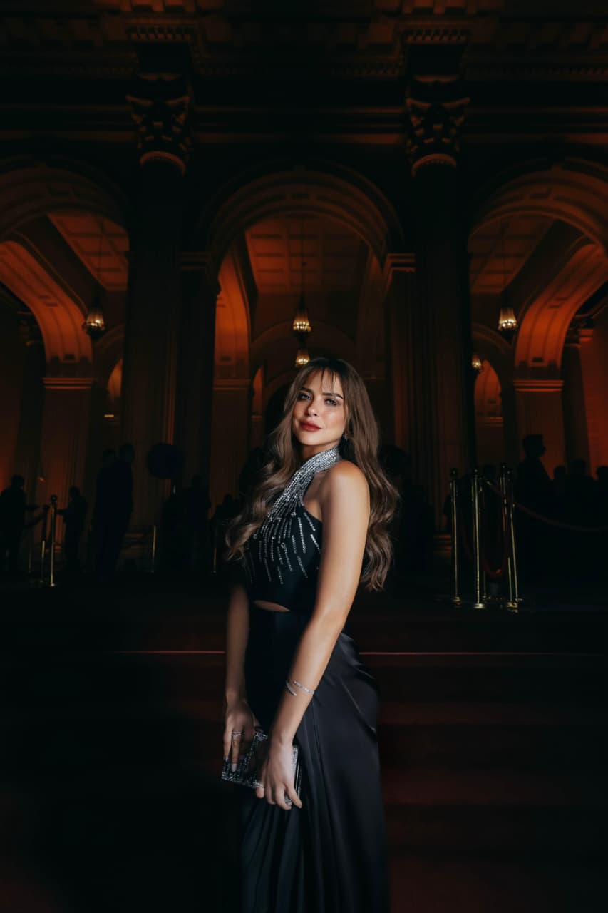 واختارت ريم مصطفى فستاناً أسود طويلاً بتصميم عصري، تميز بقصة أنثوية جذابة تجمع بين البساطة والفخامة، مع تفاصيل براقة عند منطقة الصدر أضفت لمسة من الرقي والتميّز، بينما جاء التصميم منسدلًا بانسيابية أبرز رشاقتها ومنح الإطلالة طابعاً كلاسيكياً أنيقاً، ونسّقت مع الفستان حقيبة يد صغيرة مرصعة، أكملت بها اللوك بسلاسة.