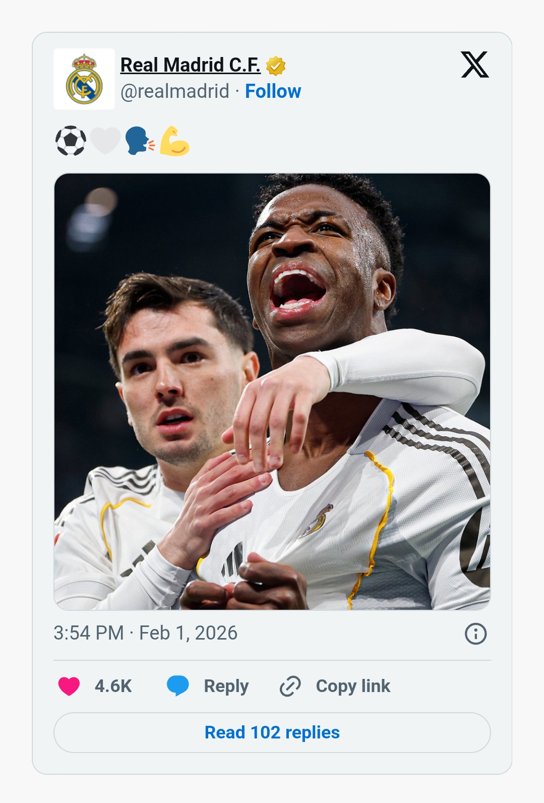 تقدم فينيسيوس جونيور بهدف مبكر لريال مدريد بتسديدة مذهلة في الدقيقة 15. وذهب اللاعب البرازيلي للاحتفال مع المشجعين مشيراً إلى قميصه، رداً على الاستقبال العدائي الذي تعرض له الفريق بسبب الخسارة الأخيرة في دوري أبطال أوروبا.