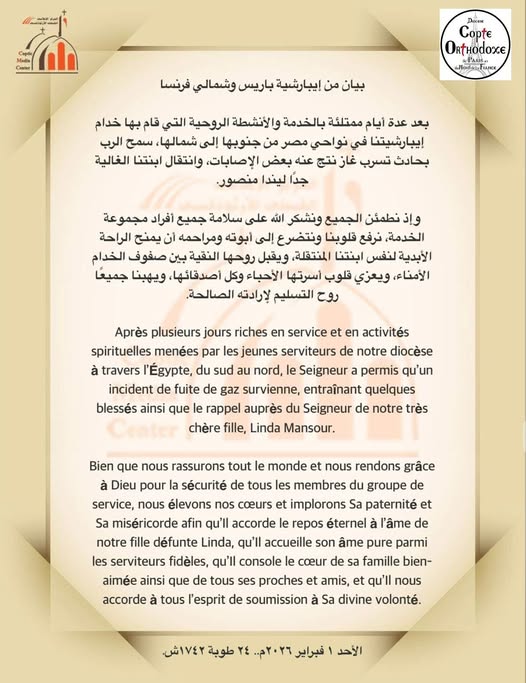 أصدرت إيبارشية باريس وشمال فرنسا بياناً تنعي فيه ابنتها الخادمة ليندا منصور، التي انتقلت إلى الأمجاد السماوية إثر حادث تسرب غاز أليم تعرضت له مجموعة الخدمة التابعة للإيبارشية خلال تواجدهم في مصر أثناء تواجدهم بأسوان.