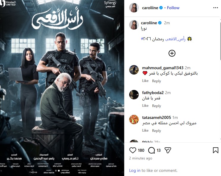 وتجسد كارولين عزمي خلال أحداث المسلسل دور فتاة تدعي نور، ونشرت كارولين البوستر الرسمي والفردي لها في العمل، من خلال حسابها الرسمي عبر موقع تبادل الصور والفيديوهات القصيرة إنستجرام، وكتبت: «نورا.. رأس الأفعى في رمضان 2026».