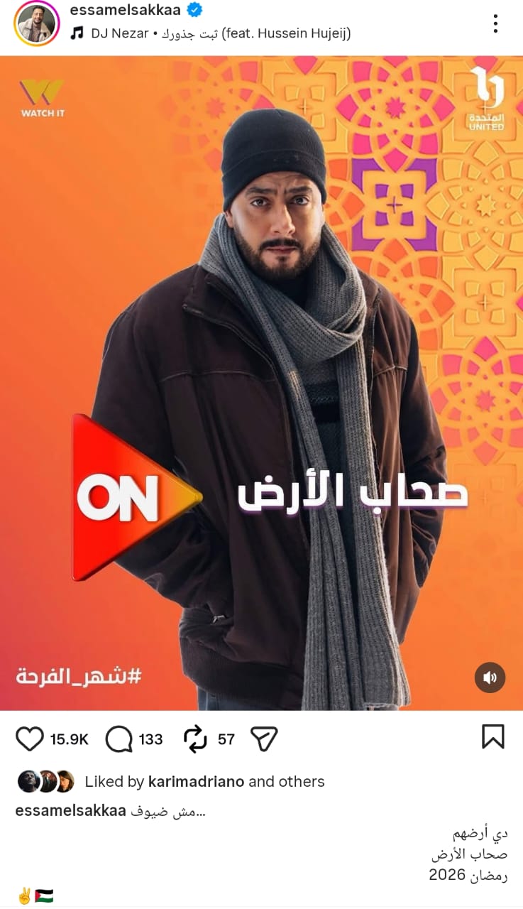 وكشف عصام السقا عن البوستر الفردي له في العمل، وكتب من خلال حسابه الرسمي عبر موقع تبادل الصور والفيديوهات القصيرة إنستجرام، قال: مش ضيوف دي أرضهم.. صحاب الأرض في رمضان 2026، كما وضع علم فلسطين في إِارة إلى دعمه لهم.