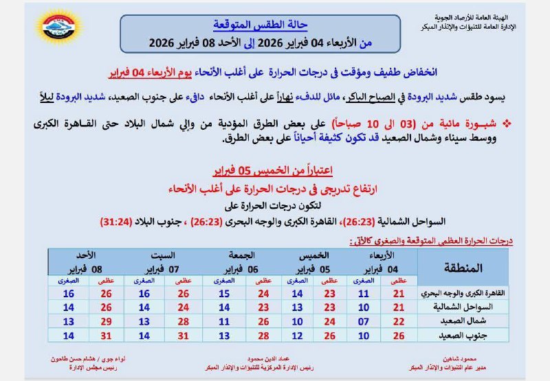 ووفقًا لبيانات هيئة الأرصاد الجوية، فإن البلاد تتأثر بانخفاض طفيف ومؤقت في درجات الحرارة يوم الأربعاء 4 فبراير 2026، يعقبه ارتفاع تدريجي اعتبارًا من الخميس، ليستمر حتى نهاية الأسبوع.