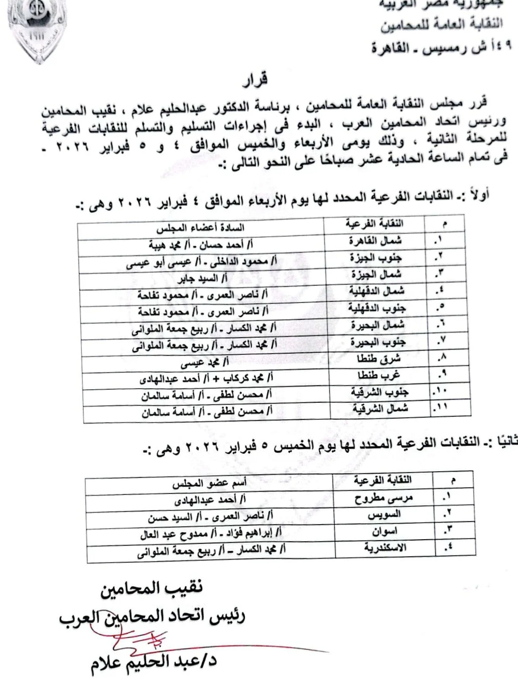 قرر مجلس النقابة العامة للمحامين، برئاسة الدكتور عبد الحليم علام، نقيب المحامين ورئيس اتحاد المحامين العرب، البدء في إجراءات التسليم والتسلم للنقابات الفرعية للمرحلة الثانية، وذلك يومي الأربعاء والخميس الموافقين 4 و5 فبراير 2026، في تمام الساعة الحادية عشرة صباحًا.