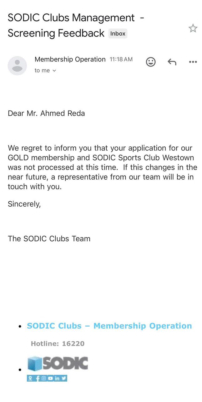 وقال صاحب رضا فى رسالته التى لاقت تفاعلا واسعا من جمهور المتابعين: النهارده جالي أغرب إيميل في حياتي . تم رفض طلبنا للتقديم على عضويه نادي Club S Sodic Sports Club لاننا لا ننتمي لـ community اللى جوا كل دا من خلال form بتملاها الأول يعني من غير انترفيو . موظف بياخد 10 أيام بيتفرج على بياناتك واكونتات السوشيال ميديا بتاعتك كلها انت وعيلتك وبتشتغل ايه وفين وولادك في مدارس ايه ومعاك ممتلكات ايه ومشترك فين …. الخ ".