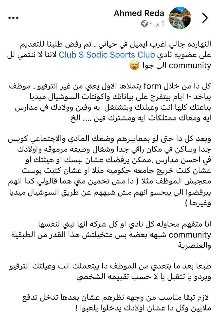 وقال رضا: أنا متفهم محاوله كل نادي أو كل شركه انها تبني لنفسها community شبهه بعضه بس متخيلتش هذا القدر من الطبقية والعنصرية طبعا بعد ما بتعدي من الموظف دا بيتعملك انت وعيلتك انترفيو وبردو يا تتقبل يا لا حسب تقييمه الشخصي لازم تبقا مناسب من وجهه نظرهم عشان بعدها تدخل تدفع ملايين وكل دا عشان اولادك يدخلوا يلعبوا !.