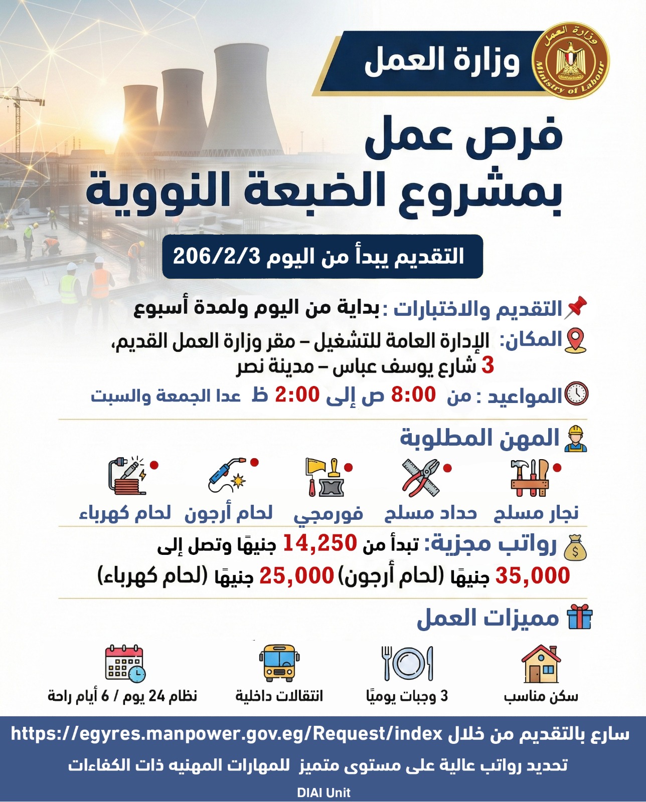 وأوضحت أن هذه الفرص تم توفيرها بالتعاون مع شركة «نيكيمت» إحدى الشركات المنفذة للمشروع، في إطار استراتيجية الدولة لربط التدريب بالتشغيل وتوفير فرص عمل لائقة للشباب داخل المشروعات القومية الكبرى...وأكد وزير العمل محمد جبران أن مشروع الضبعة النووية يُعد أحد أهم المشروعات الاستراتيجية القومية، ويوفر فرص عمل حقيقية ومستقرة برواتب مجزية، مشددًا على حرص الوزارة على اختيار العمالة الفنية الماهرة وفق معايير دقيقة تضمن جودة التنفيذ وتحقيق أعلى معدلات السلامة المهنية داخل مواقع العمل.