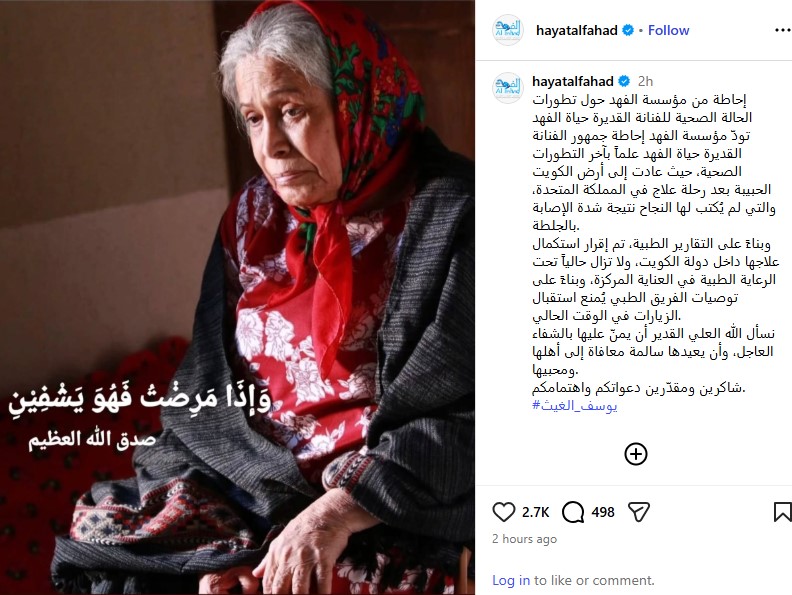 أضافت: تودّ مؤسسة الفهد إحاطة جمهور الفنانة القديرة حياة الفهد علماً بآخر التطورات الصحية، حيث عادت إلى أرض الكويت الحبيبة بعد رحلة علاج في المملكة المتحدة، والتي لم يُكتب لها النجاح نتيجة شدة الإصابة بالجلطة.