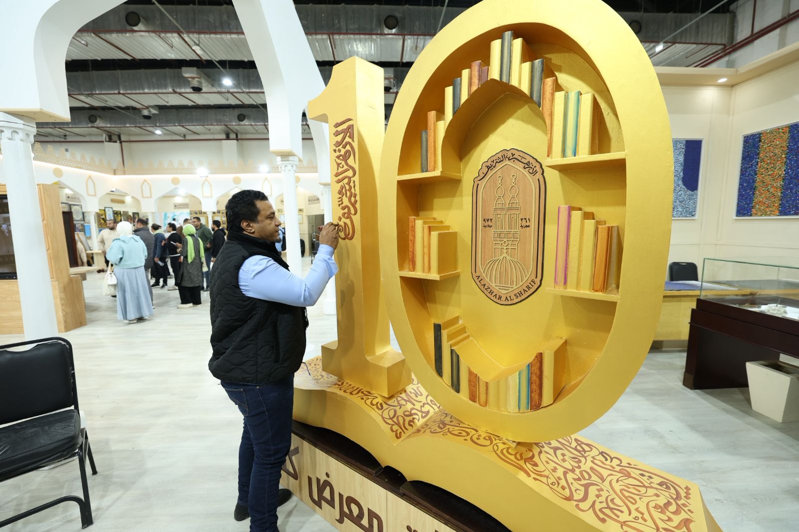 وأسدل الستار على فعاليات الجناح بعمل فني استثنائي نفّذه فنانو الأزهر داخل مكتب الابتكار، تمثّل في جدارية عملاقة توثّق أبرز محطات مسيرة فضيلة الإمام الأكبر الأستاذ الدكتور أحمد الطيب، شيخ الأزهر الشريف، على مدار ثمانية عقود من العطاء، حيث جسّدت الجدارية مواقفه في دعم المصالحات المجتمعية، وإصلاح ذات البين، وحقن الدماء، ودحض الثأر، فضلًا عن جهوده في إرساء السلام العالمي وتوقيع وثيقة الأخوّة الإنسانية، وغيرها من المحطات المفصلية في مسيرته الدعوية والإنسانية.