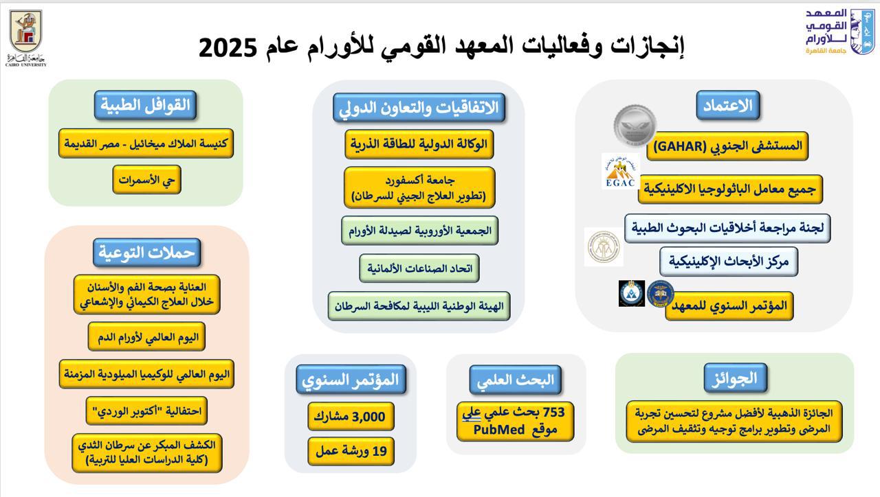 كما رصد التقرير، تنظيم المعهد العديد من الفعاليات والقوافل الطبية، مثل القافلة الطبية الشاملة في جميع التخصصات بكنيسة الملاك ميخائيل – مصر القديمة (سبتمبر 2025)، والقافلة الطبية التوعوية بحي الأسمرات (أكتوبر 2025)، إلى جانب تنظيم العديد من حملات التوعية، منها اليوم التوعوي للعناية بصحة الفم والأسنان خلال العلاج الكيماوي والإشعاعي بمستشفى الثدي (مارس 2025)، والاحتفال باليوم العالمي لأورام الدم (مايو 2025)، والاحتفال باليوم العالمي لليوكيميا الميلودية المزمنة (سبتمبر 2025).