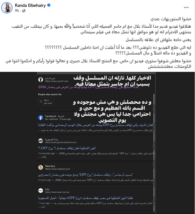أثارت الفنانة راندا البحيري جدلًا واسعًا، وذلك بعد الأخبار التي تم تداولها خلال الساعات القليلة الماضية بوقف مسلسل روح أوف بطولة الفنان منذر رحيانة.