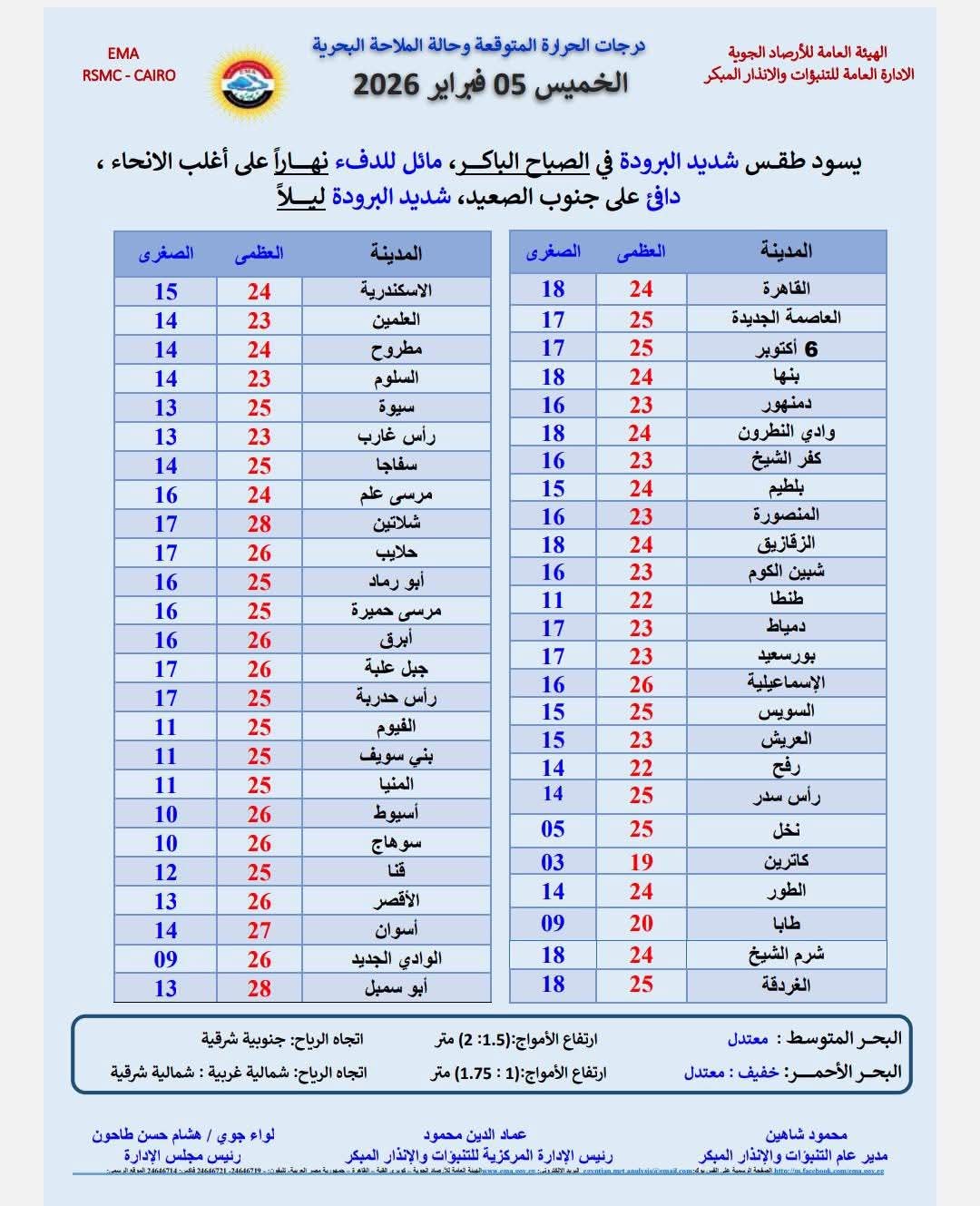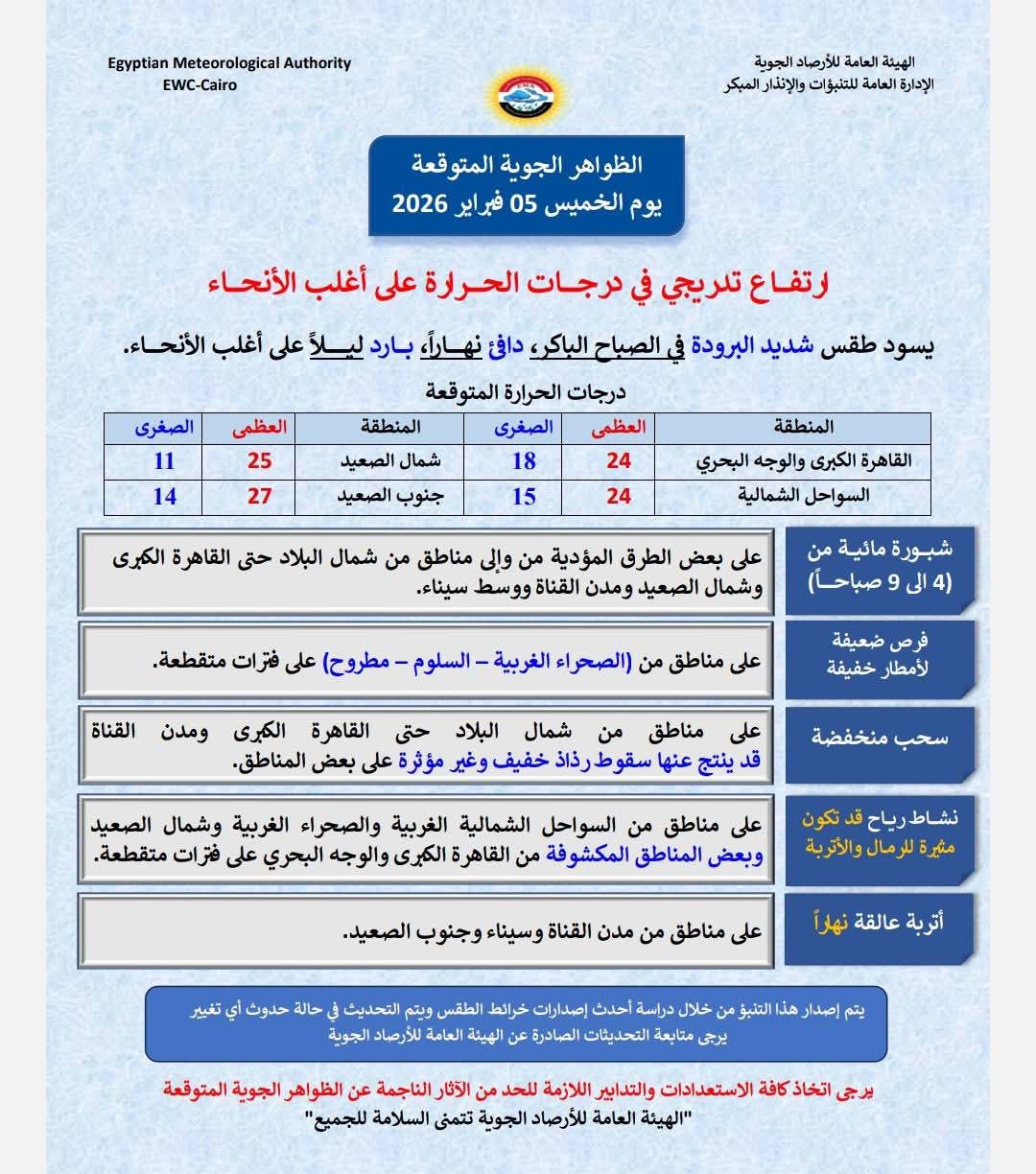 أعلنت الهيئة العامة للأرصاد الجوية عن توقعات حالة الطقس ليوم غد الخميس الموافق 05 فبراير 2026، حيث تشهد البلاد ارتفاعاً تدريجياً في درجات الحرارة على أغلب الأنحاء، حيث يسود طقس شديد البرودة في الصباح الباكر مائل للدفء نهاراً على أغلب الأنحاء، بينما يكون دافئاً على جنوب الصعيد، ليعود شديد البرودة ليلاً.