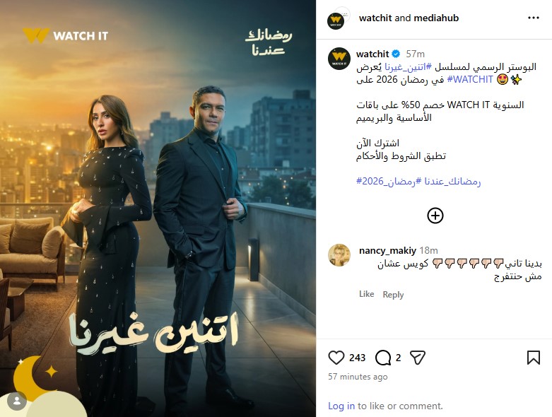 وكتبت Watch it من خلال حسابها الرسمي عبر موقع تبادل الصور والفيديوهات القصيرة إنستجرام: البوستر الرسمي لـ مسلسل «اتنين غيرنا» يُعرض في رمضان 2026 على WATCHIT.