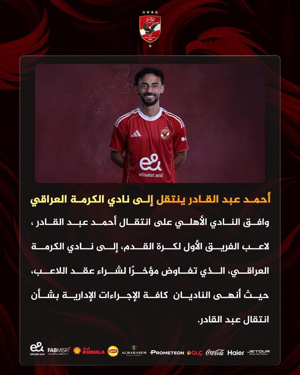 أعلن النادي الأهلي رسميًا انتقال لاعبه أحمد عبد القادر إلى نادي الكرمة العراقي خلال سوق الانتقالات الشتوية الحالية، بعد إتمام كافة الإجراءات الإدارية بين الناديين.