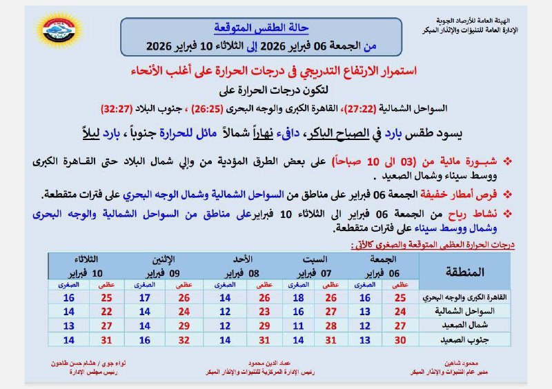 حالة الطقس غداً الجمعة 6 فبراير 2026 في مصر.. تزداد معدلات البحث من جانب المواطنين عن حالة الطقس غداً الجمعة 6 فبراير 2026، خاصة مع التغيرات المستمرة في درجات الحرارة خلال الأيام الحالية ورغبة الكثيرين في متابعة توقعات الهيئة العامة للأرصاد الجوية لمعرفة حالة الأجواء المتوقعة وخريطة الظواهر الجوية حتى مطلع الأسبوع المقبل، سواء للمسافرين أو العاملين في الصباح الباكر أو من يخططون للأنشطة اليومية خارج المنزل.