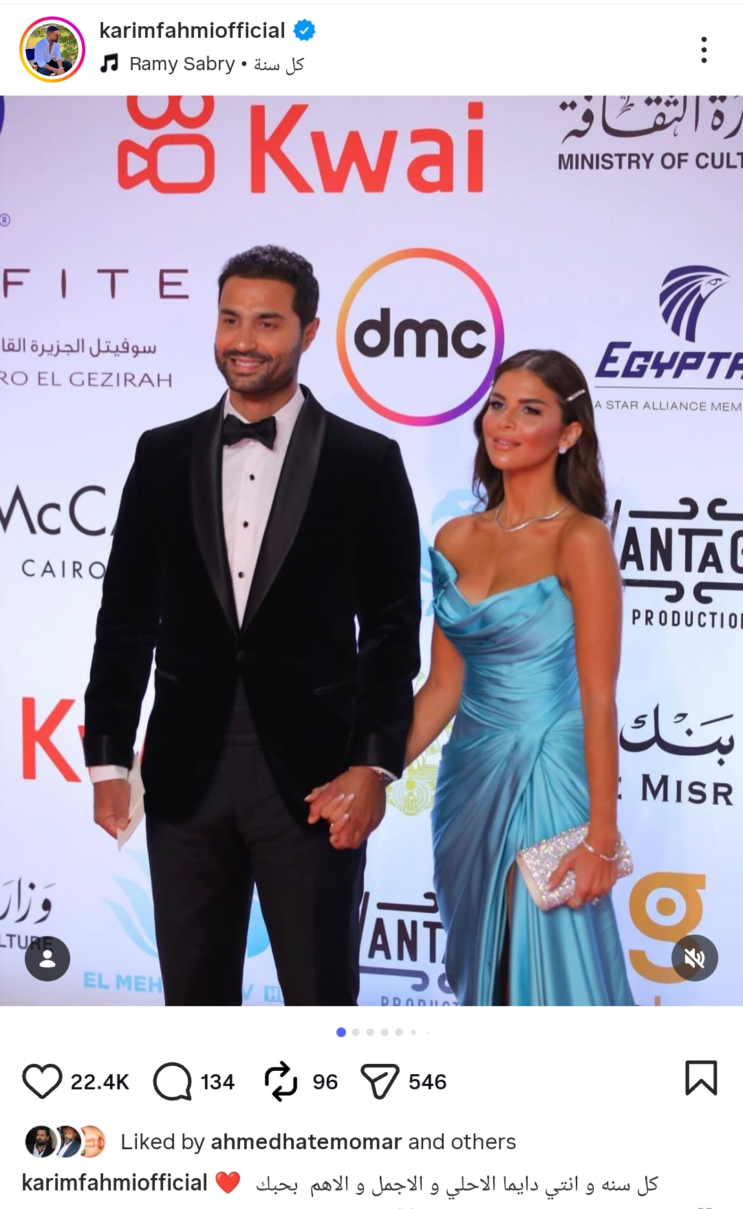 ووجه كريم فهمي رسالة رومانسية لزوجته، حيث نشر صورا تجمعهما من خلال حسابه الرسمي عبر موقع تبادل الصور والفيديوهات القصيرة إنستجرام، وكتب: كل سنة وانتي دايمًا الأحلى والأجمل والأهم.. بحبك.