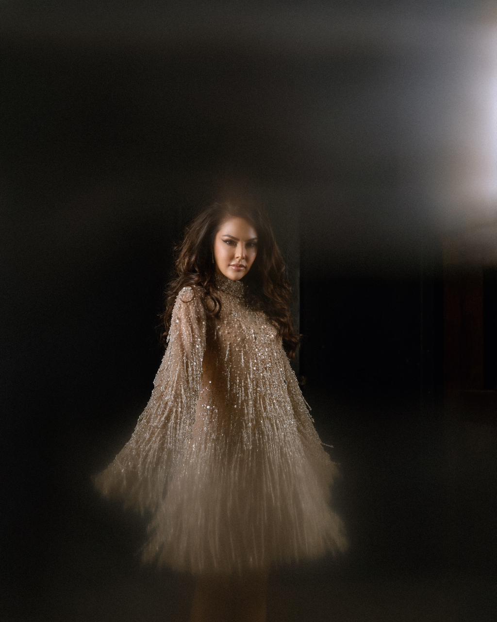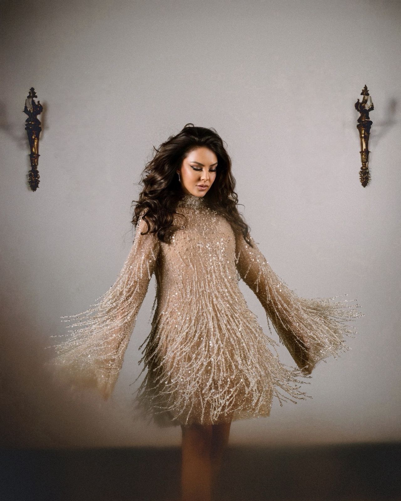 واعتمدت الفنانة الصاعدة نينا مغربي فستانا ذا قصة طويلة بأكمام شفافة واسعة، تميزت بتطريز كثيف ومتدرج أضفى حركة وحيوية على التصميم، بينما جاءت الياقة المرتفعة لتمنح الإطلالة لمسة من الرقي الكلاسيكي، في توازن ذكي مع جرأة الخامة وتفاصيلها اللامعة.