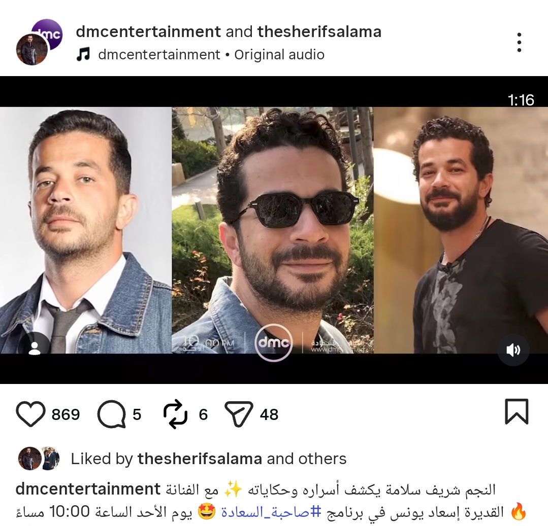 وكشفت قناة دي إم سي عن برومو الحلقة، وكتبت من خلال حسابها الرسمي عبر موقع تبادل الصور والفيديوهات القصيرة إنستجرام، قالت: النجم شريف سلامة يكشف أسراره وحياته مع الفنانة إسعاد يونس في برنامج صاحبة السعادة يوم الأحد الساعة 10:00 مساء.
