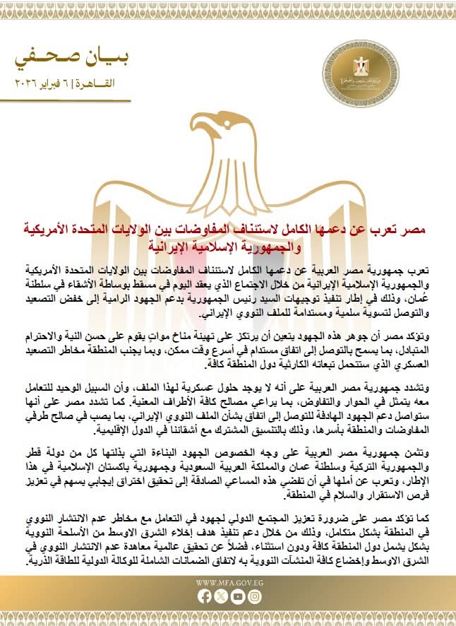 أعربت مصر عن دعمها الكامل لاستئناف المفاوضات بين الولايات المتحدة الأمريكية والجمهورية الإسلامية الإيرانية من خلال الاجتماع الذي يعقد اليوم في مسقط بوساطة الأشقاء في سلطنة عمان، وذلك في إطار تنفيذ توجيهات السيد رئيس الجمهورية بدعم الجهود الرامية إلى خفض التصعيد والتوصل لتسوية سلمية ومستدامة للملف النووي الإيراني.