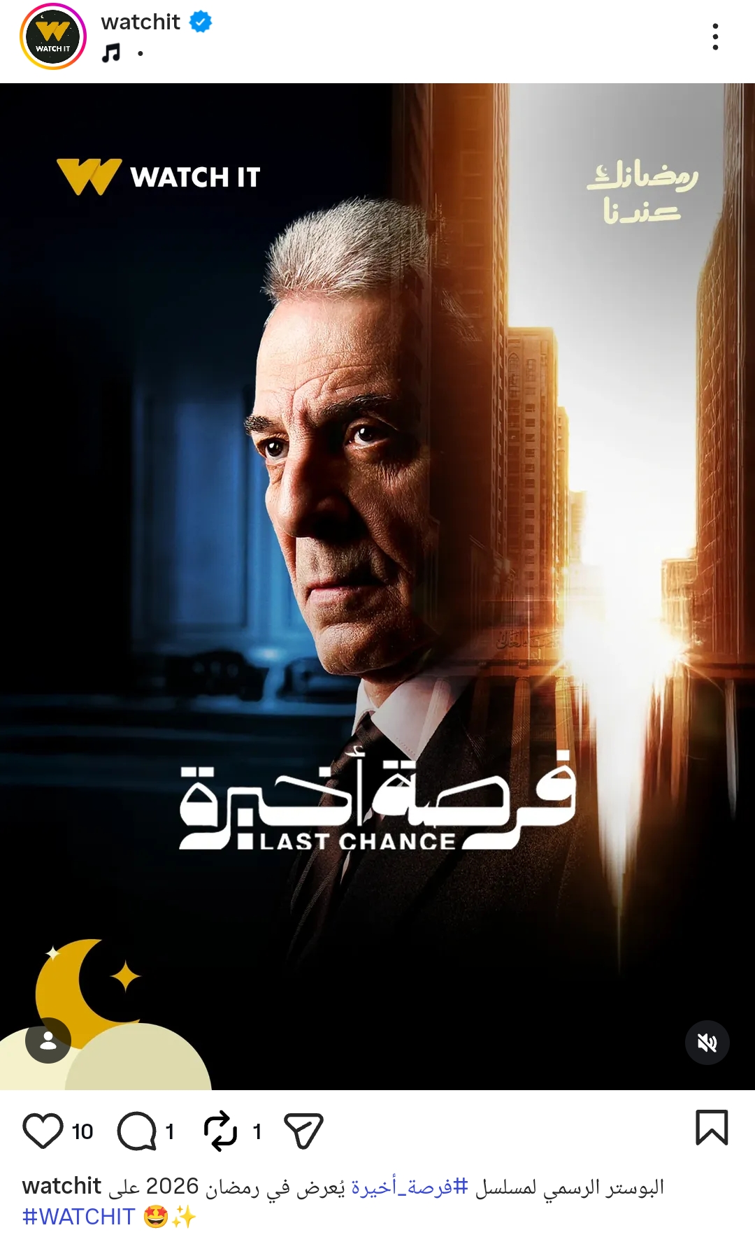 ونشرت Watch it البوستر من خلال حسابها الرسمي عبر موقع تبادل الصور والفيديوهات القصيرة إنستجرام، وعلقت: البوستر الرسمي لمسلسل فرصة أخيرة يعرض في رمضان 2026 على Watch it.