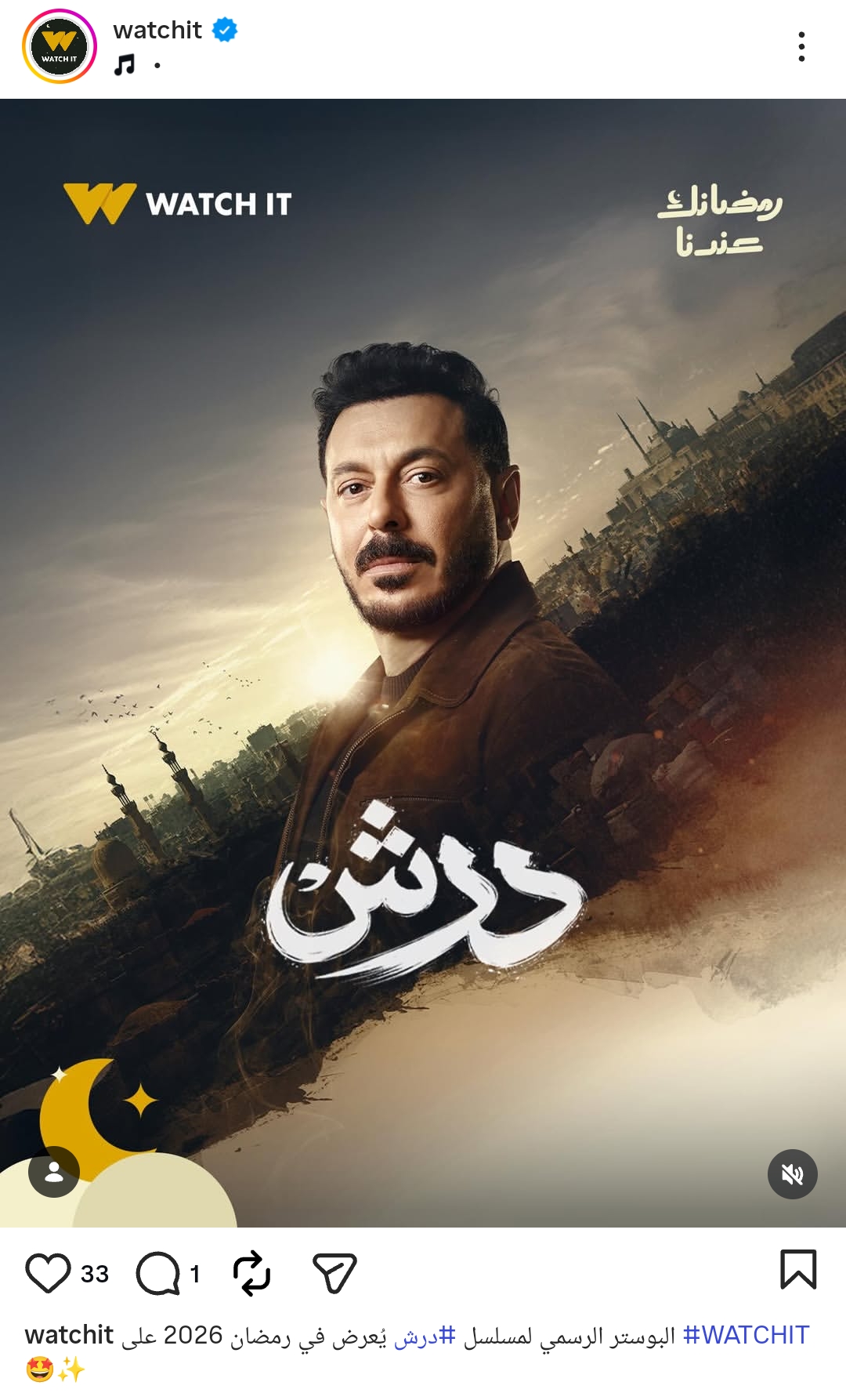 ونشرت Watch it البوستر من خلال حسابها الرسمي عبر موقع تبادل الصور والفيديوهات القصيرة إنستجرام، وعلقت: البوستر الرسمي لـ مسلسل درش يُعرض في رمضان 2026 على Watch it.
